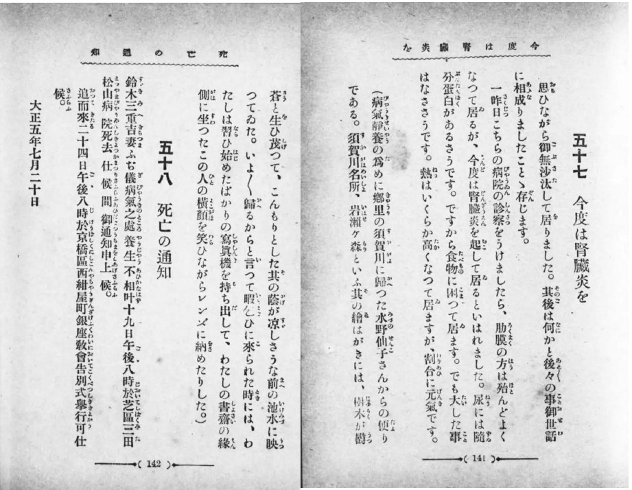 【本文】 思ひながら御無沙汰して居りました。其後は何かと後々の事御世話 に相成りましたことゝ存じます。 一昨日こちらの病院の診察を受けましたら、肋膜の方は殆んどよく なつて居るが、今度は腎臓炎を起して居るといはれました。尿には隨 分蛋白があるさうです。ですから食物に困つて居ます。でも大した事 はなささうです。熱はいくらか高くなつて居ますが、割合に元氣です。