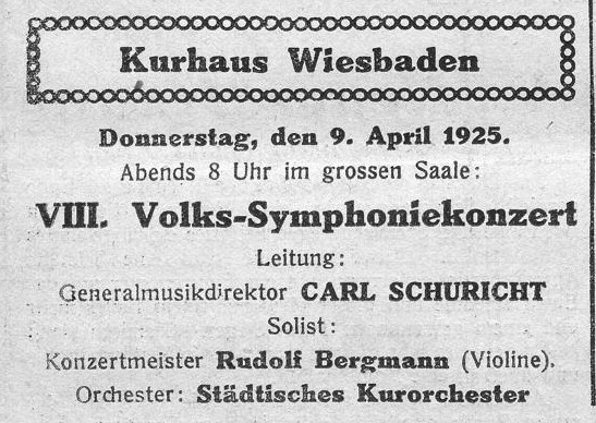 | 1914 | 13 April | Städtisches Kurorchesters | Kurhaus Wiesbaden, Abends 8 Uhr im Abonnement im großen Saale | Brahms: Sym.2, Tschaikowsky: Konzert für Violine und Orchester | Adolf Schiering (Vn.) | Symphonie-Konzert | WZ, RV | |