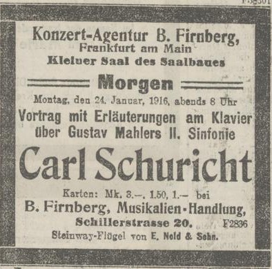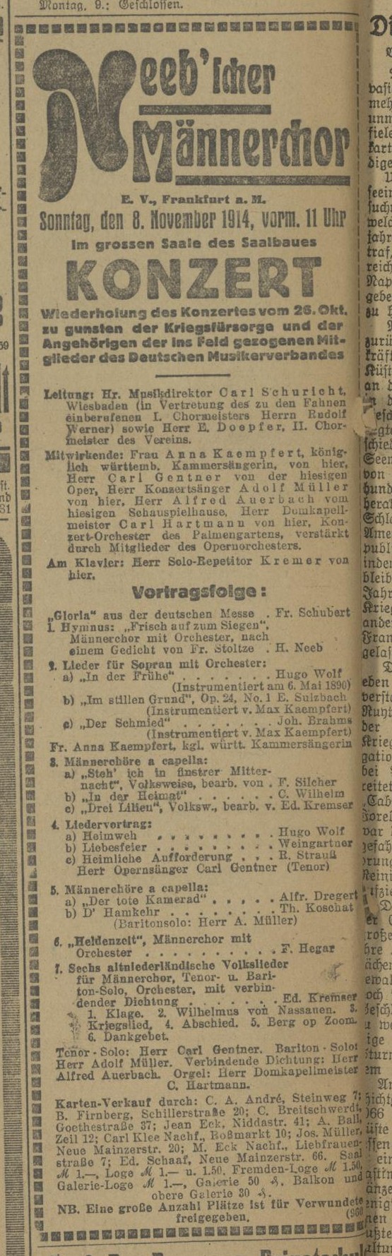 | 1914 | 7 April![]() | Das hiesige Theaterorchester | Frankfurt am Main, Saalbau, Großer Saal | Bach Kantate Nr.103 "Du Hirte Israel", Nr.20 "O Ewigkeit, du Donnerwort", Nr.78 "Jesu der du meine Seele", Nr.53 "Schlage doch, gewunste Stunde", Nr.50 "Nun ist das Heil" | Anna Kämpfert, Adrienne von Kraus-Osborne, Max Hoffmüller, Felix von Krauss, Rühl'scher Sangverein, Carl Hartmann (Org.), Wilhelm Bauer (Cem.) | 3. Abonnement-Konzert | Newspaper | |