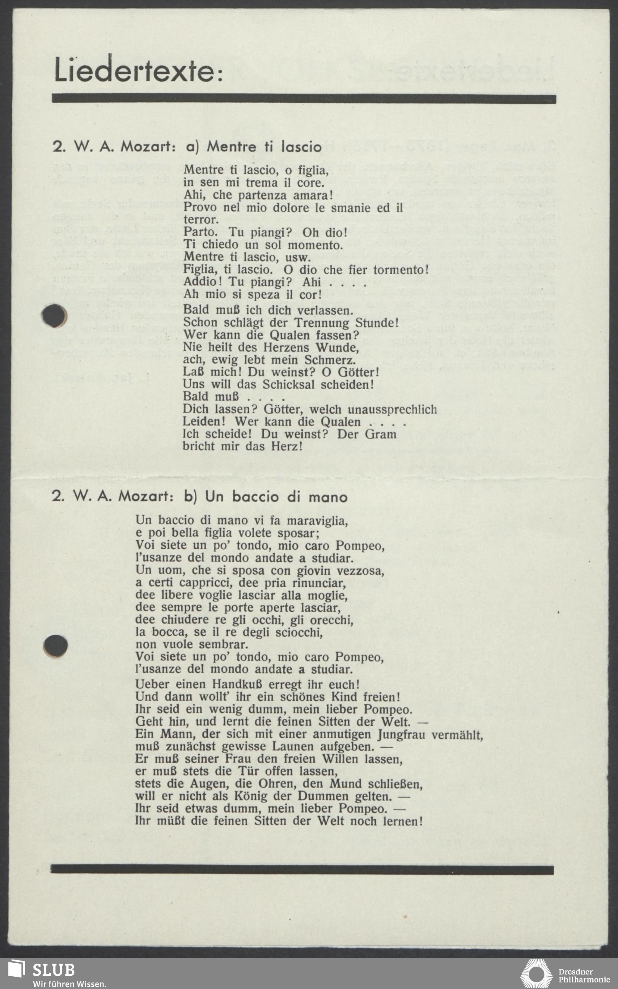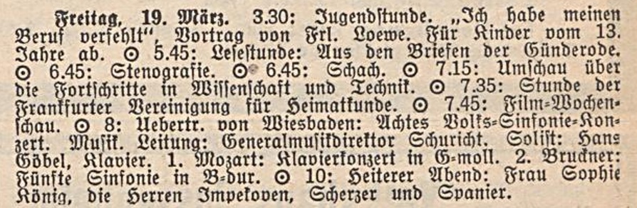 | 1914 | 26 March | Städtisches Kurorchester | Kurhaus Wiesbaden, Abends 8 Uhr | Mozart: Ouverture zu "Figaros Hochzeit", Bach: Air für Streichorchester, Mozart: Menuett aus der Es-dur-Symphonie, Mendelssohn: Ouverture zu "Athalia", Pfitzner: Ouverture zu "Das Christelflein", Schumann: Adagio aus der C-dur-Symphonie, Wagner: Vorspiel und Liebestod aus "Tristan und Isolde" | 145. Abonnements-Konzert | WNN, WB | ||