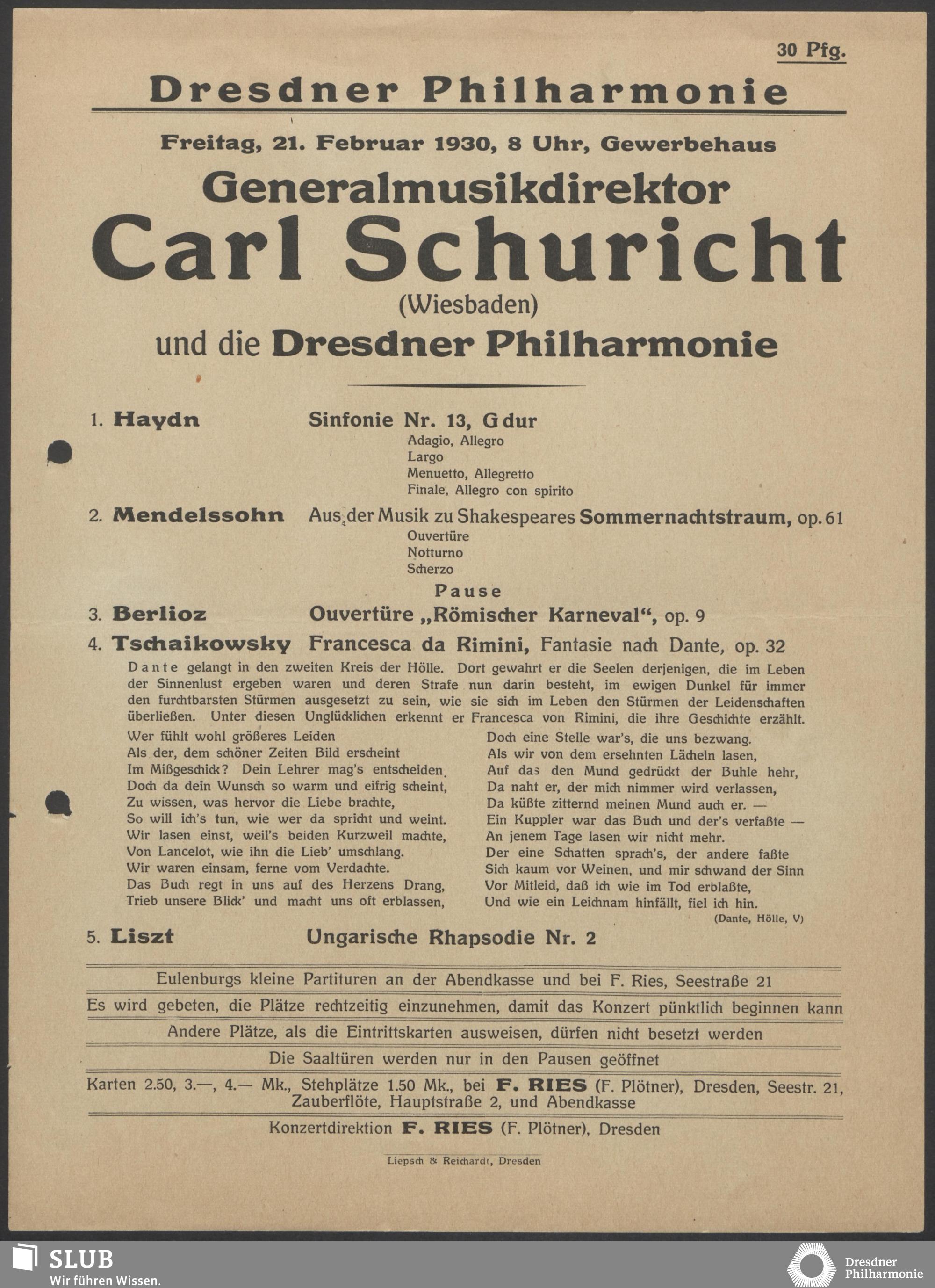 | 1914 | 18 April | Städtisches Kurorchester | Kurhaus Wiesbaden, Abends 8 Uhr | Berlioz: Fest bei Capulet a. "Romeo und Julia", Irrlichtertanz, Sylphentanz, und Ungar Marsch aus "Faust's Verdammung", Liszt: "Orpheus", symphonische Dichtung, Les prélude, symphonische Dichtung | Abonnements-Konzert | WZ | ||