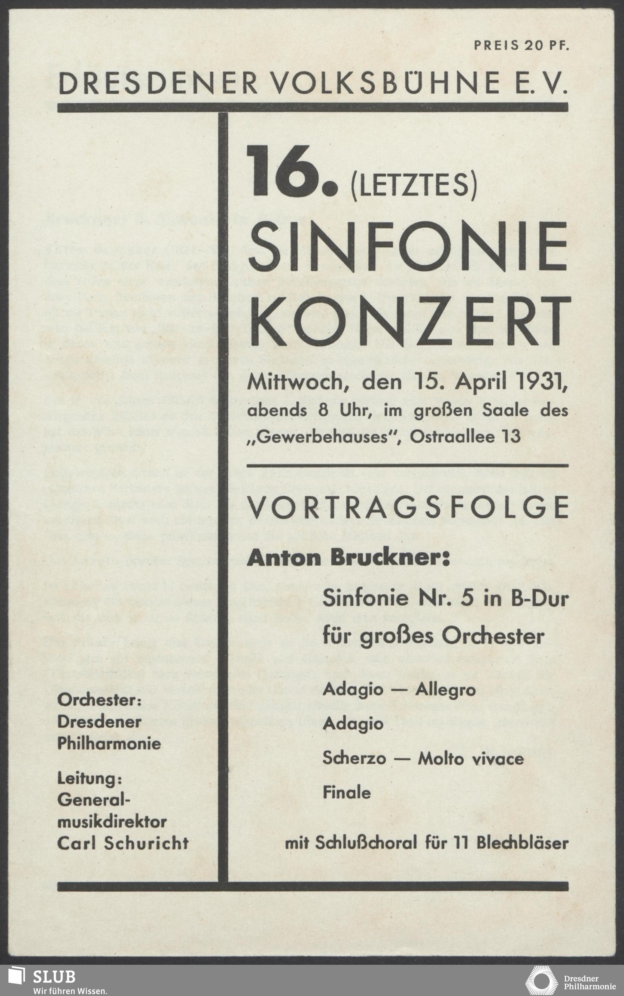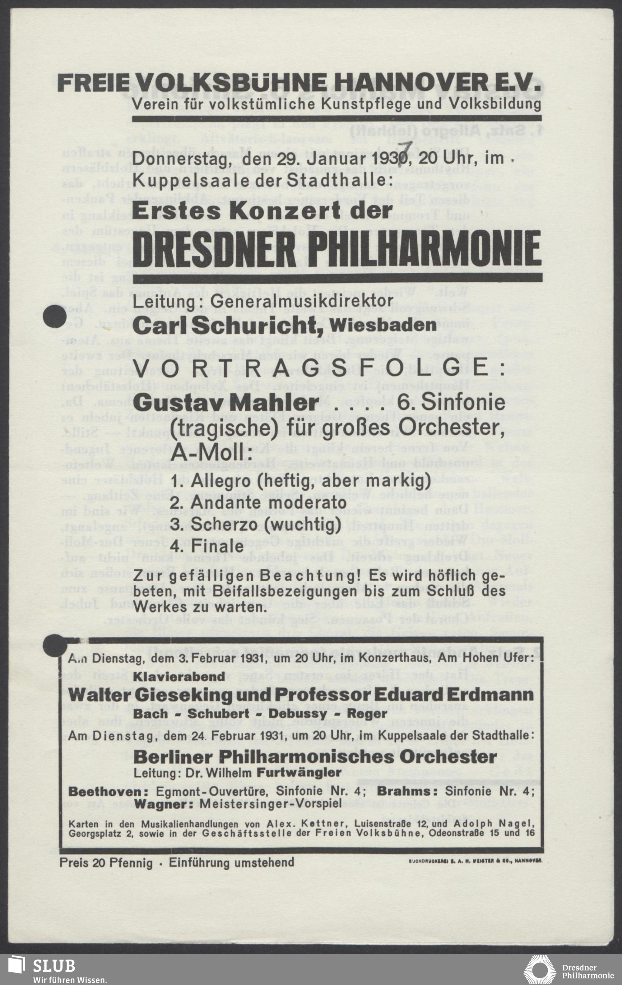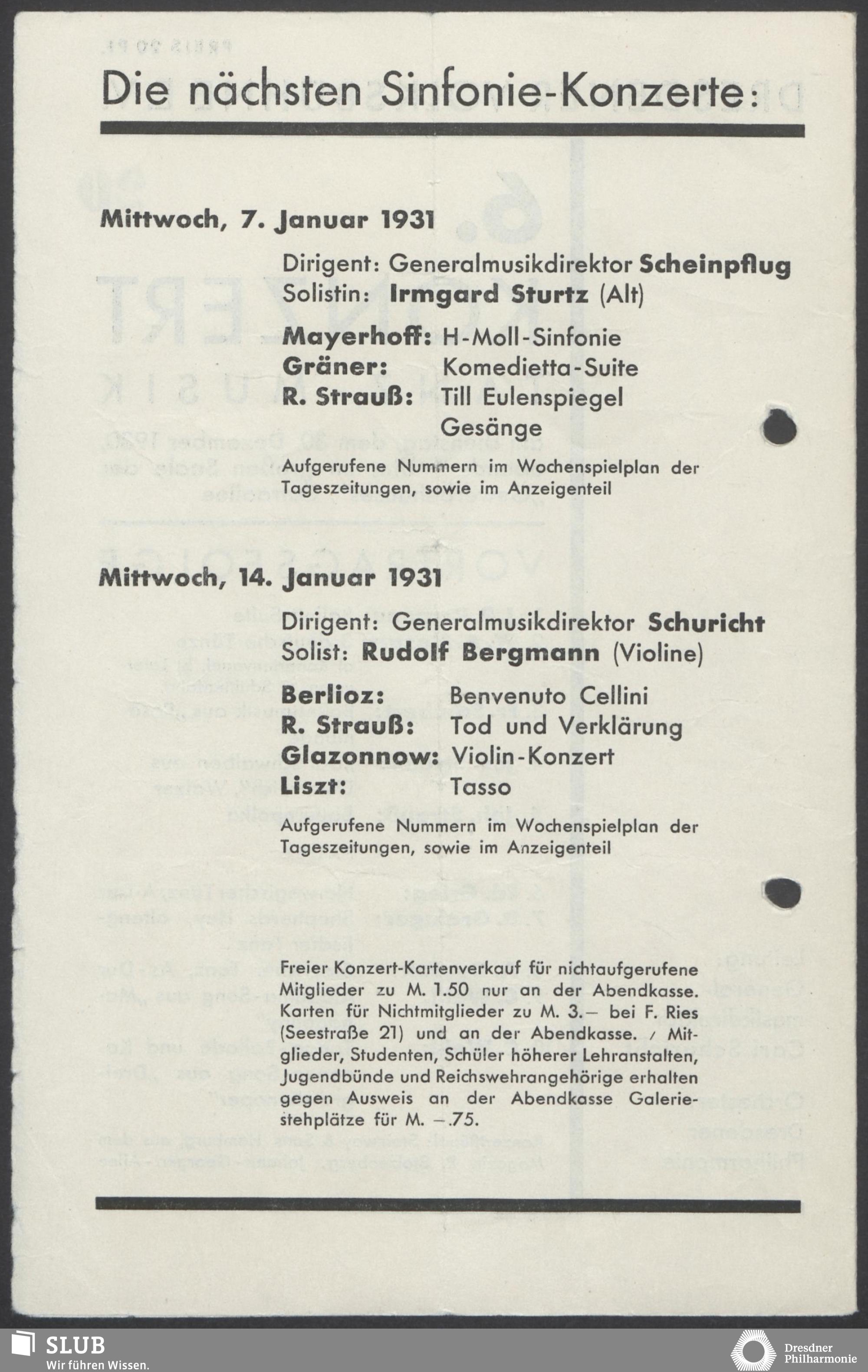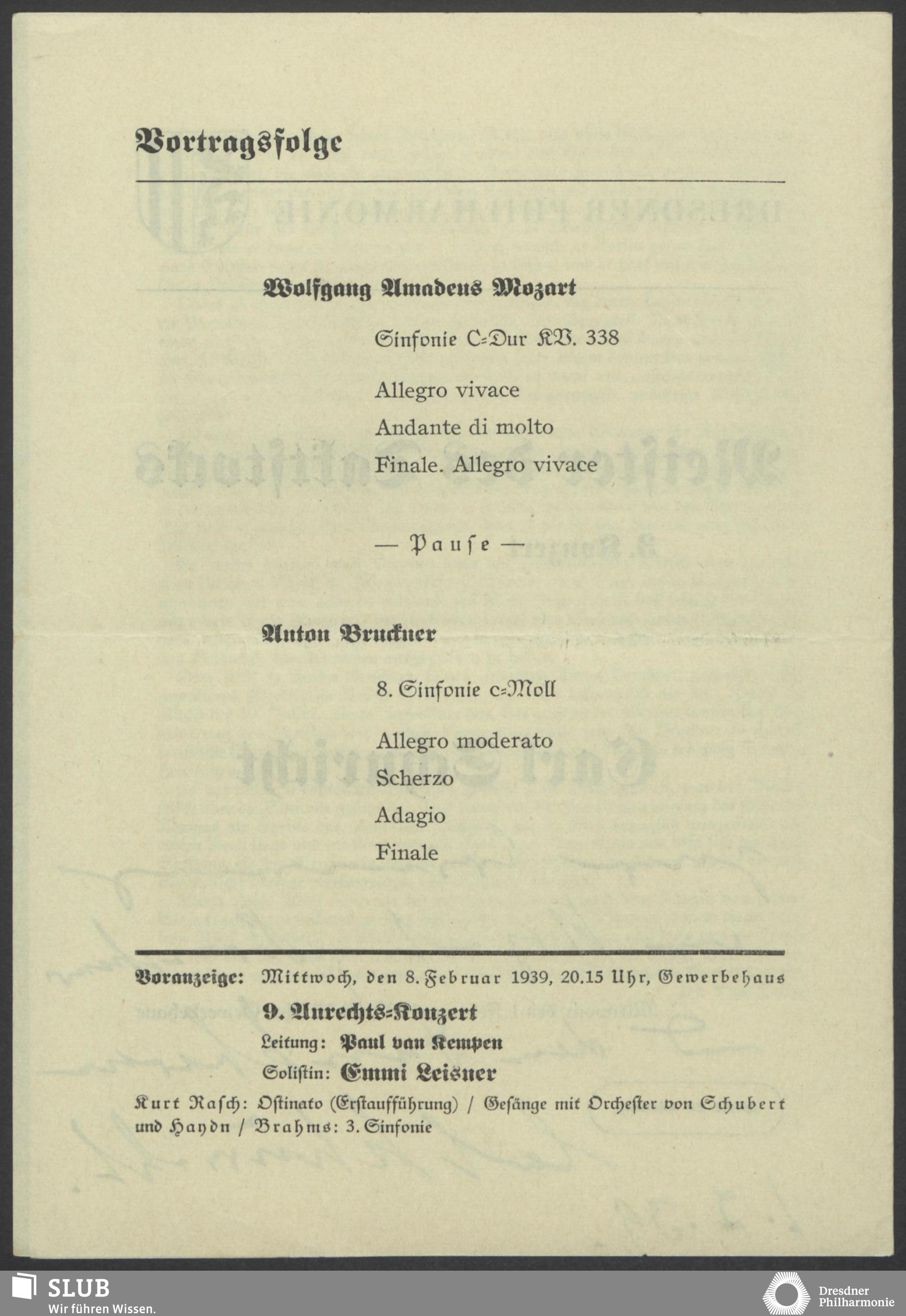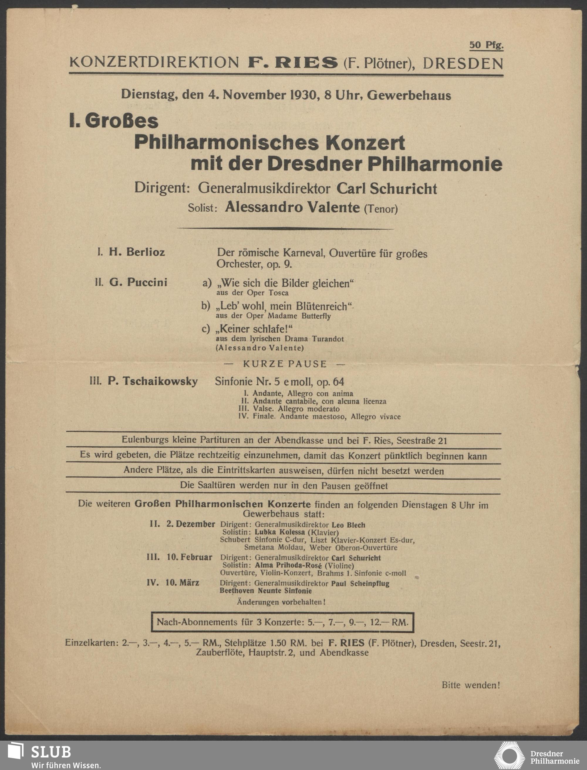 | 1914 | 16 January | Städt. Kurorchester | Abends 7 1/2 Uhr im groß Saale Uhr | Reger:Ballett-Suite, Liszt:"Tasso, lamento e trionfo", symphonische Dichtung, R. Strauss:Festliches Prälundium für grosses Orchester und Orgel | Solistin: Frau Eva Blaschke-von ber Osten, Kammersängerin, Dreëben (Sopran) | 8. Zyklus-Konzert | RV, WB | |