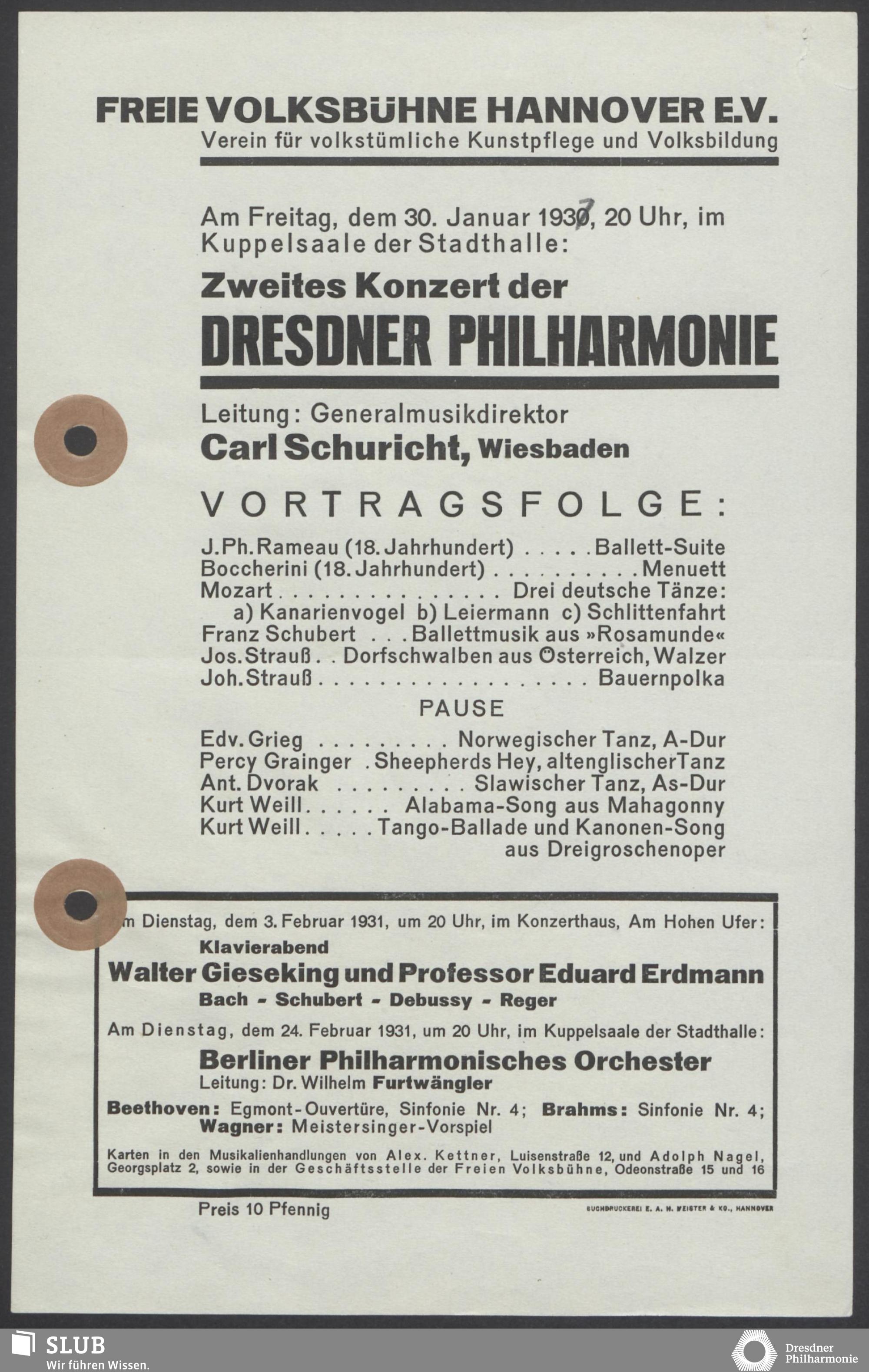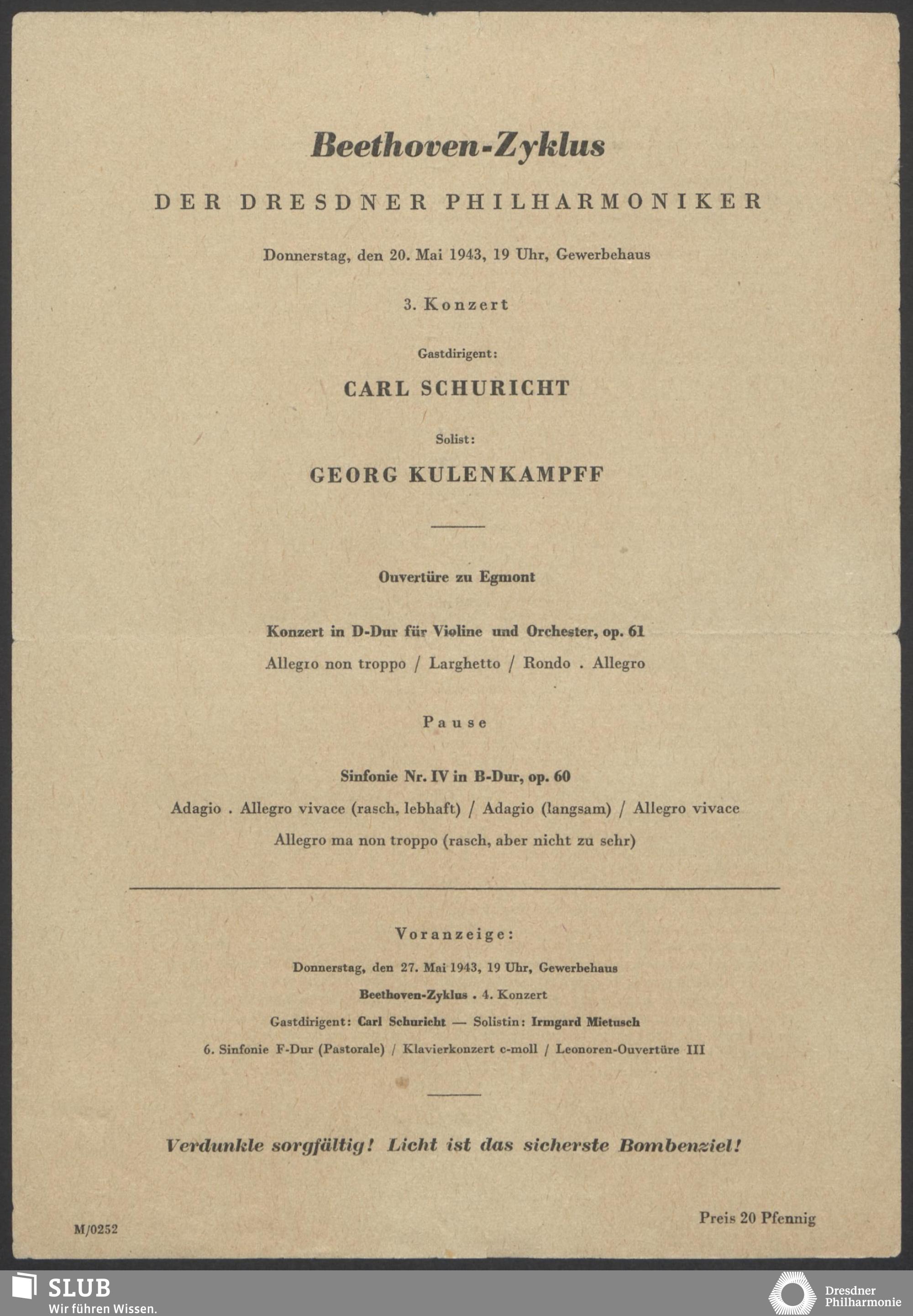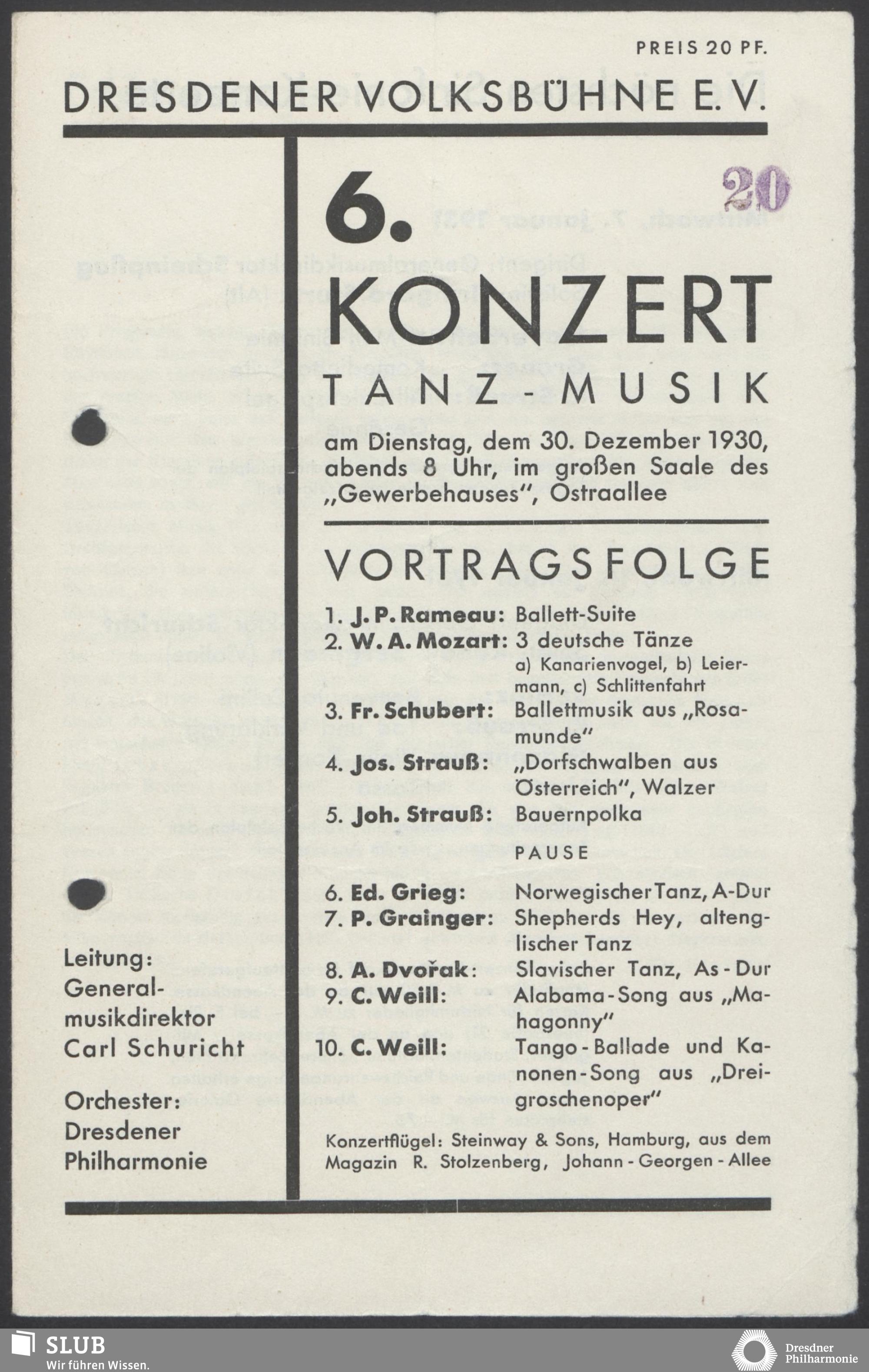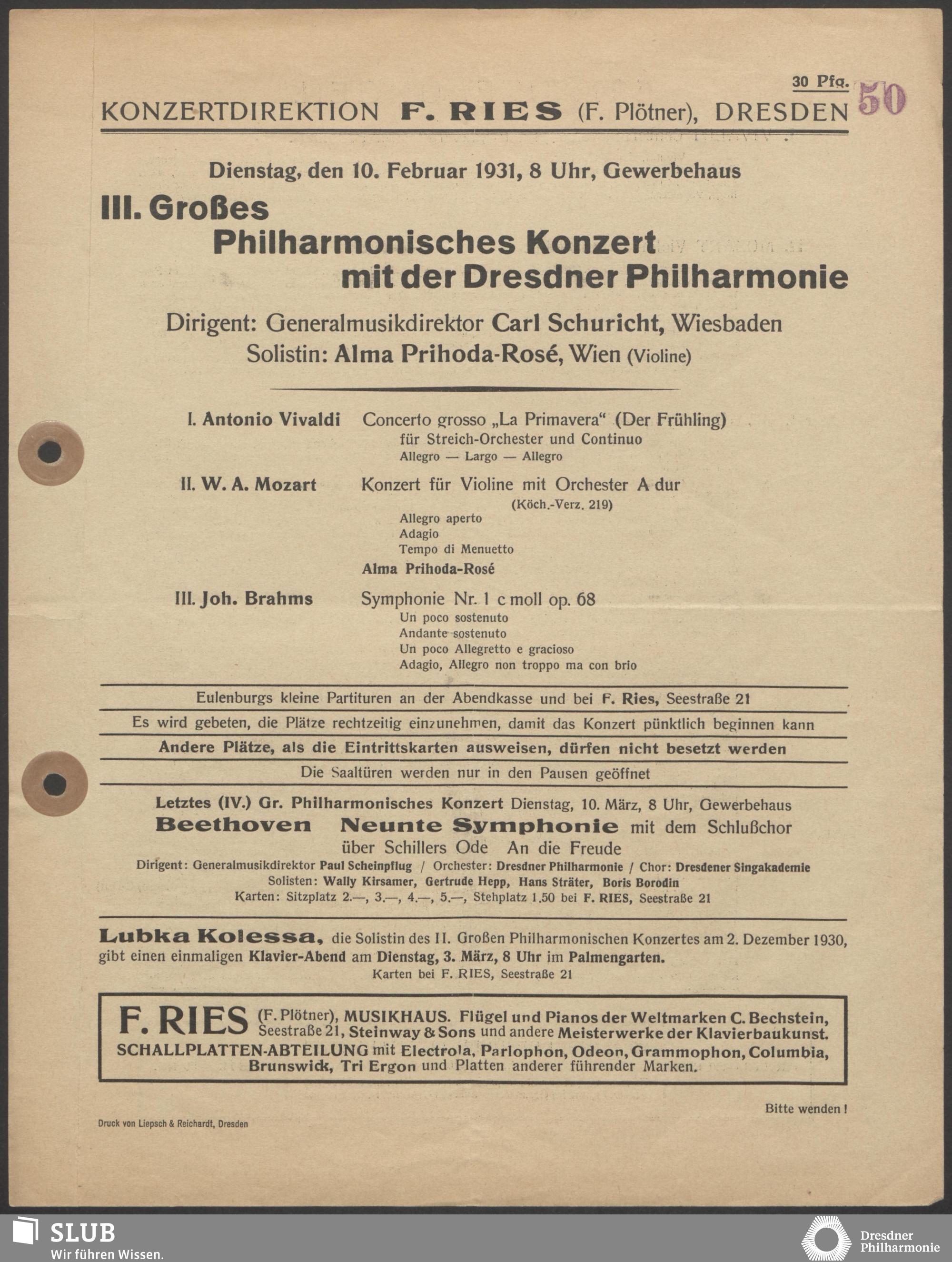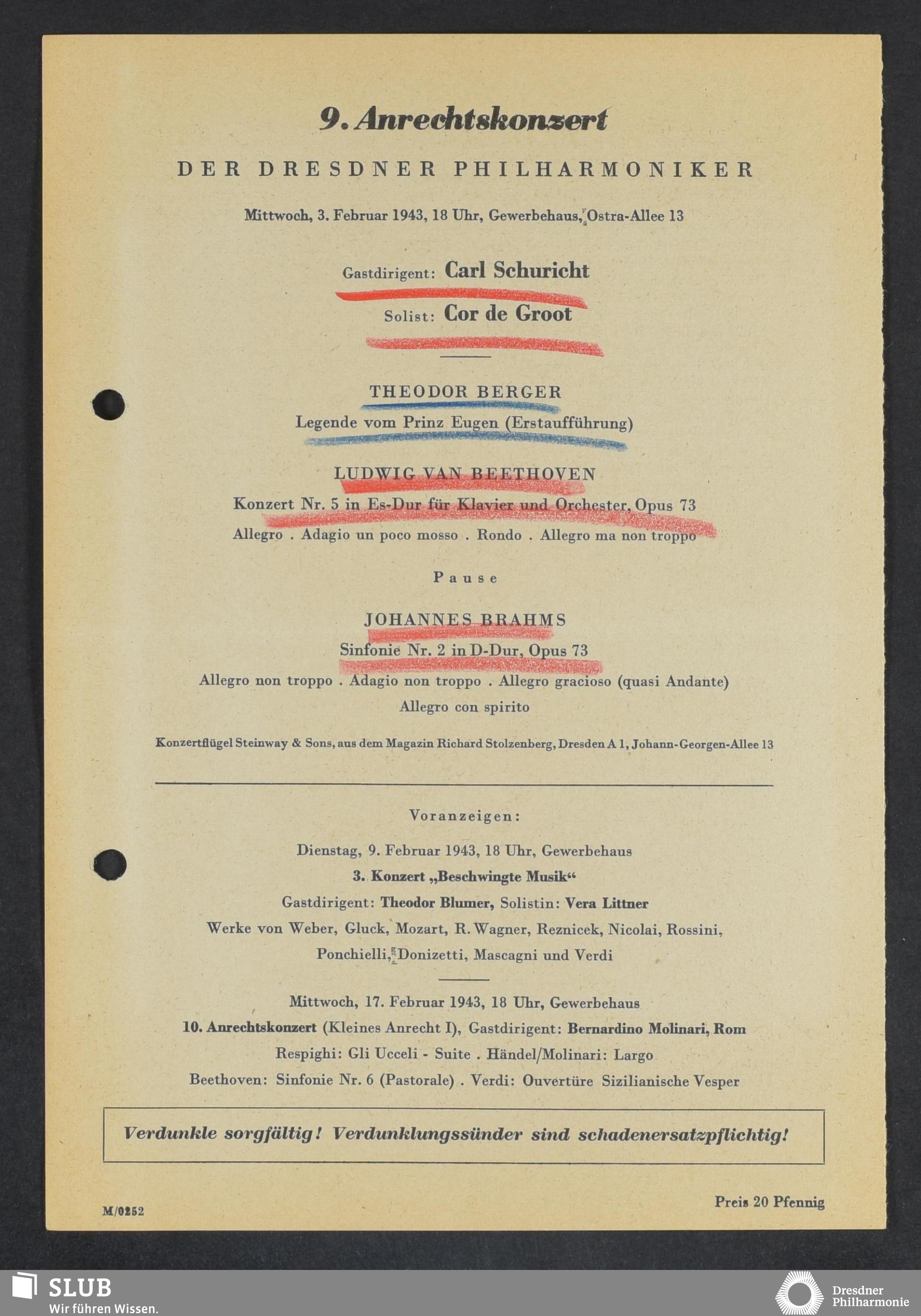 | 1914 | 16 January | Städt. Kurorchester | Abends 7 1/2 Uhr im groß Saale Uhr | Reger:Ballett-Suite, Liszt:"Tasso, lamento e trionfo", symphonische Dichtung, R. Strauss:Festliches Prälundium für grosses Orchester und Orgel | Solistin: Frau Eva Blaschke-von ber Osten, Kammersängerin, Dreëben (Sopran) | 8. Zyklus-Konzert | RV, WB | |