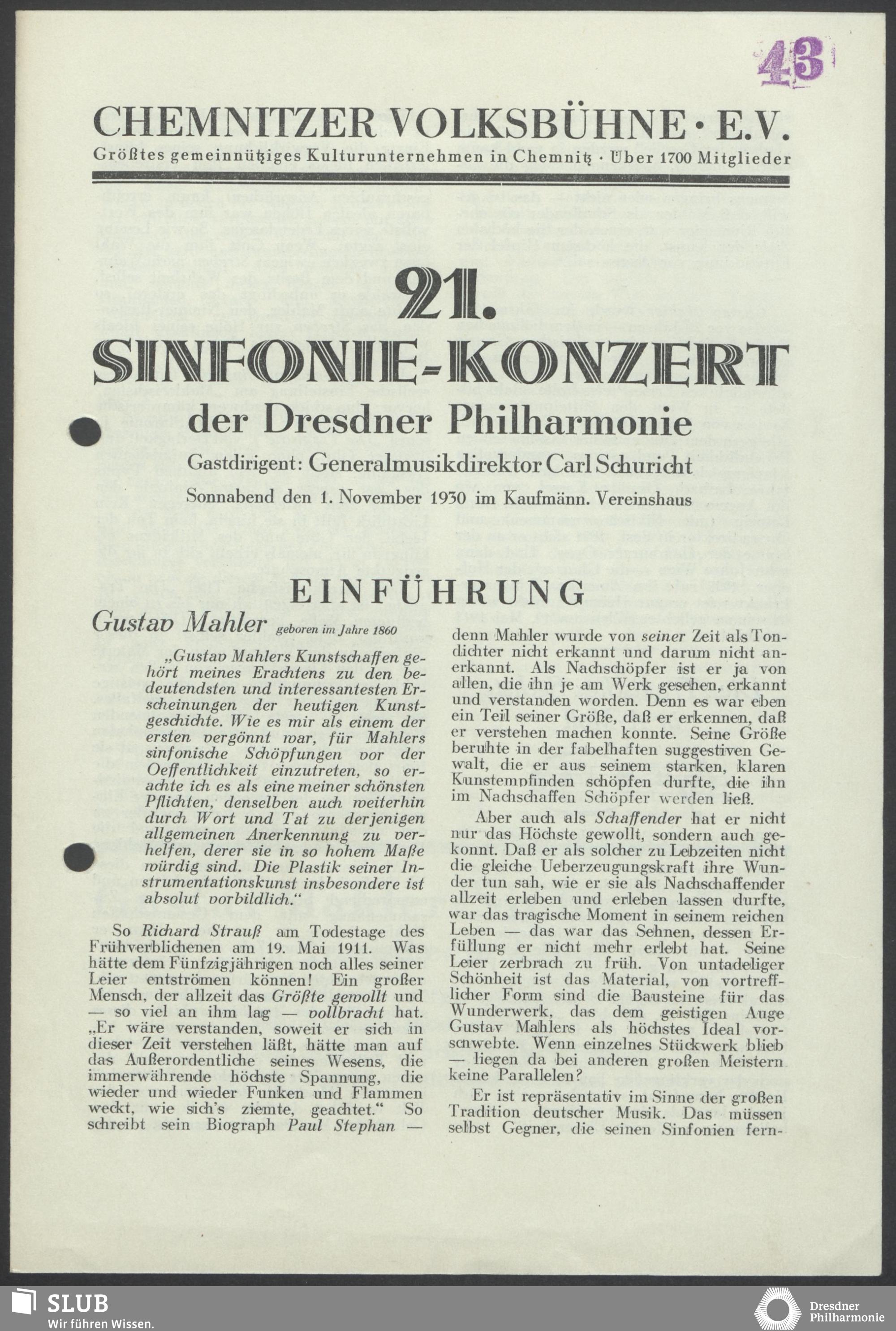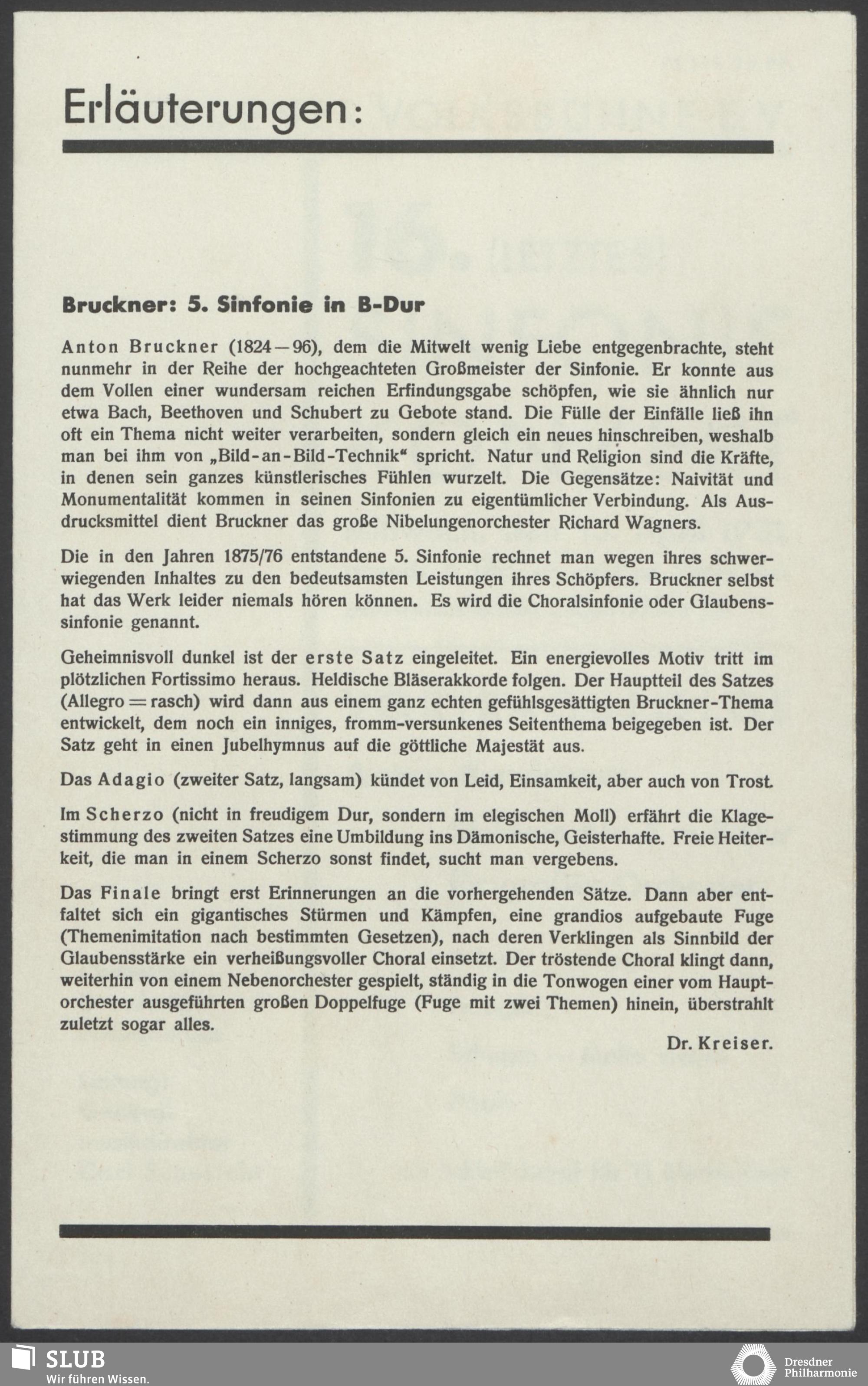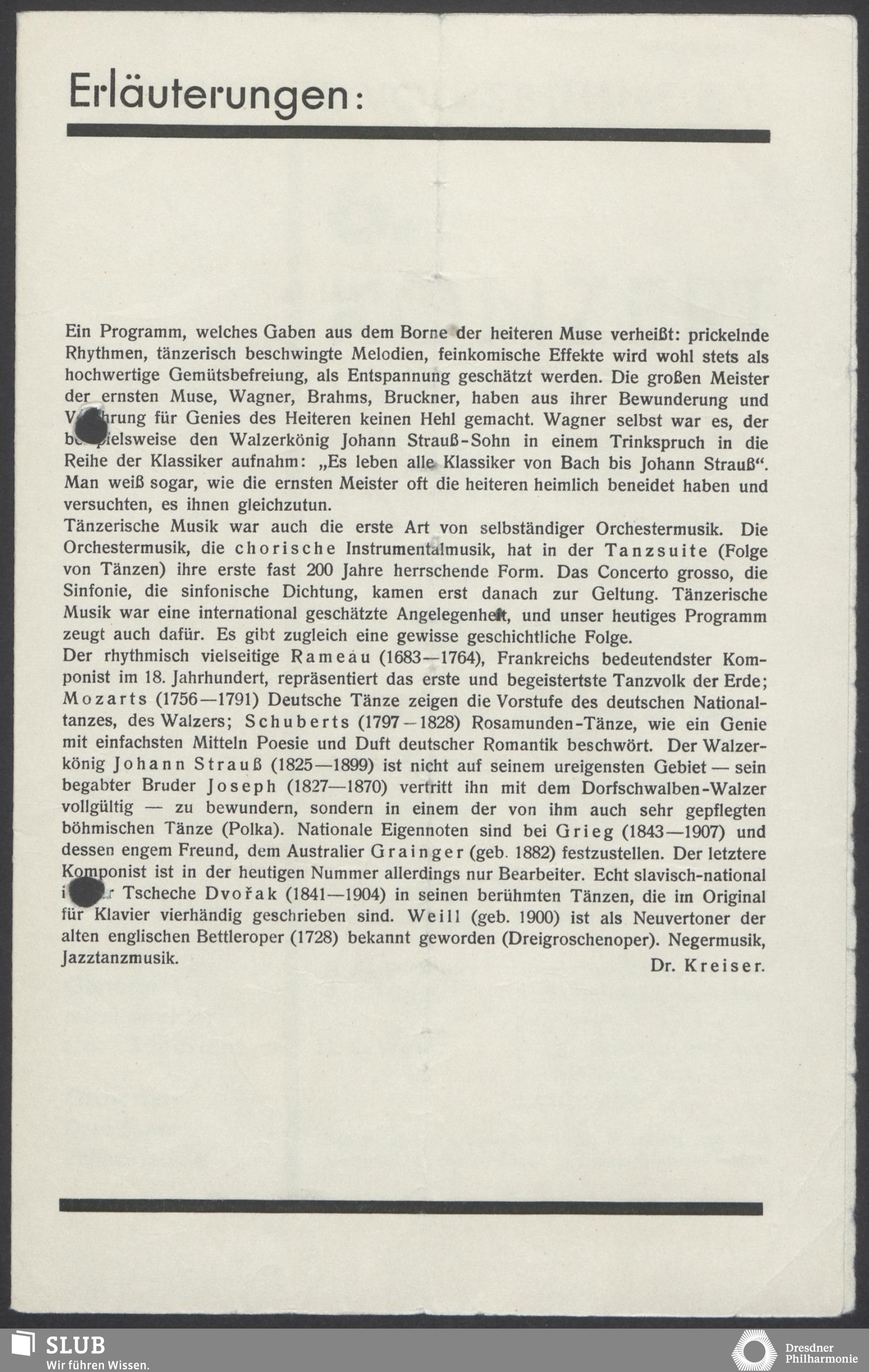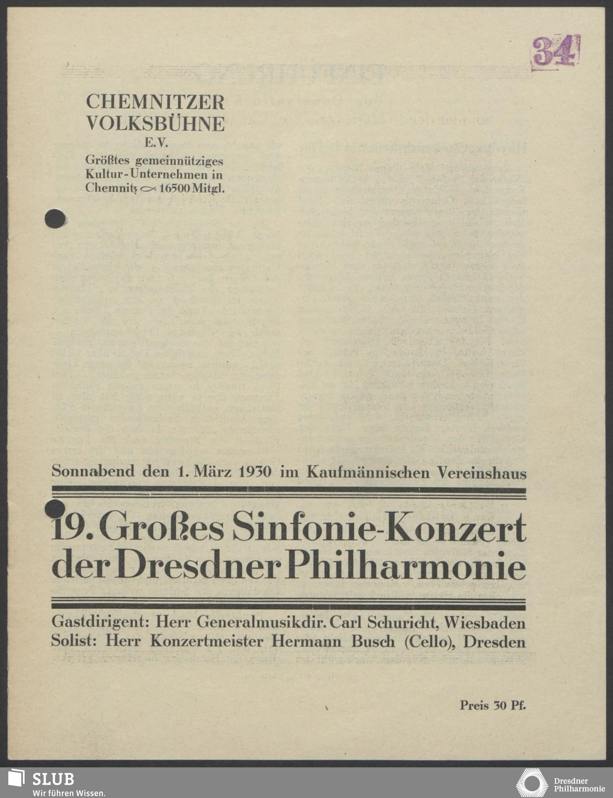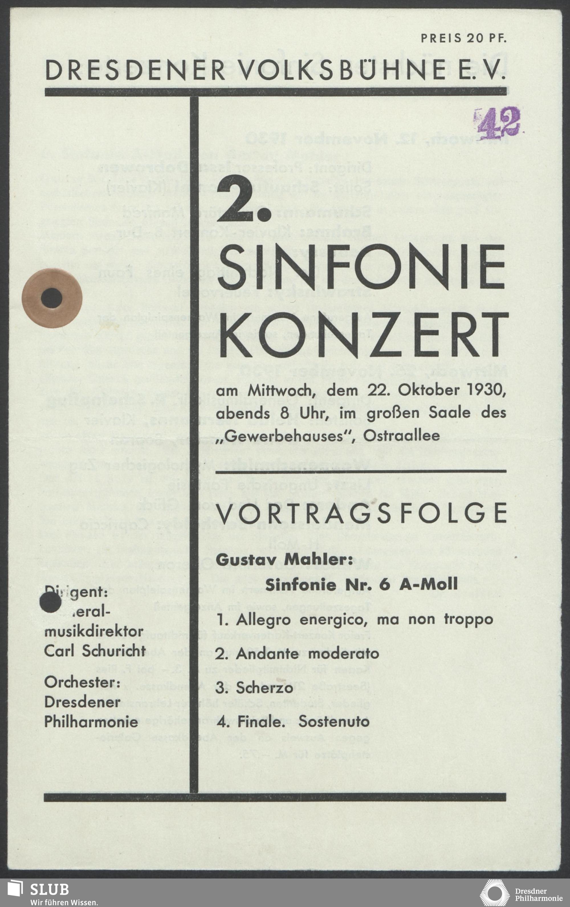 | 1914 | 16 January | Städt. Kurorchester | Abends 7 1/2 Uhr im groß Saale Uhr | Reger:Ballett-Suite, Liszt:"Tasso, lamento e trionfo", symphonische Dichtung, R. Strauss:Festliches Prälundium für grosses Orchester und Orgel | Solistin: Frau Eva Blaschke-von ber Osten, Kammersängerin, Dreëben (Sopran) | 8. Zyklus-Konzert | RV, WB | |