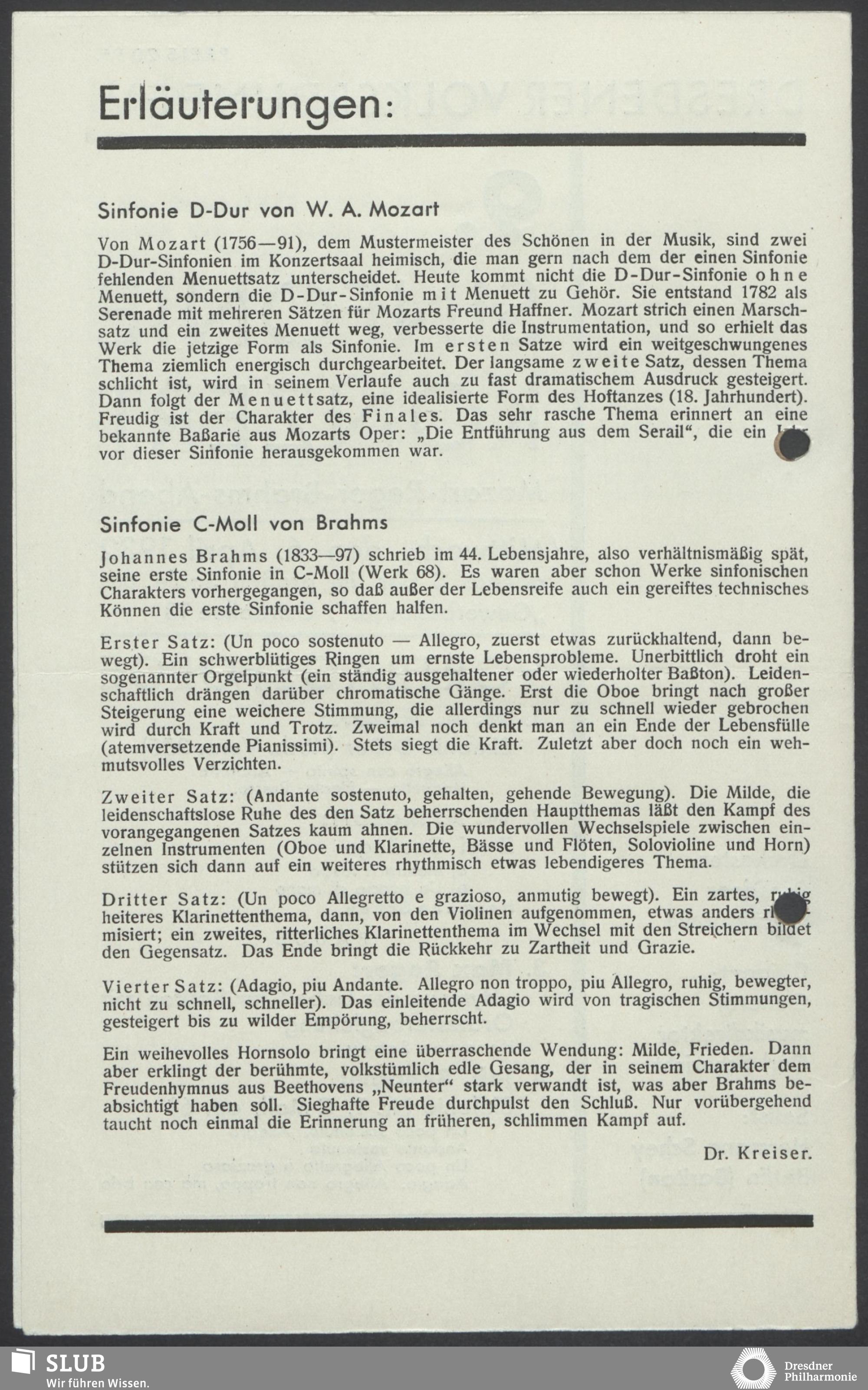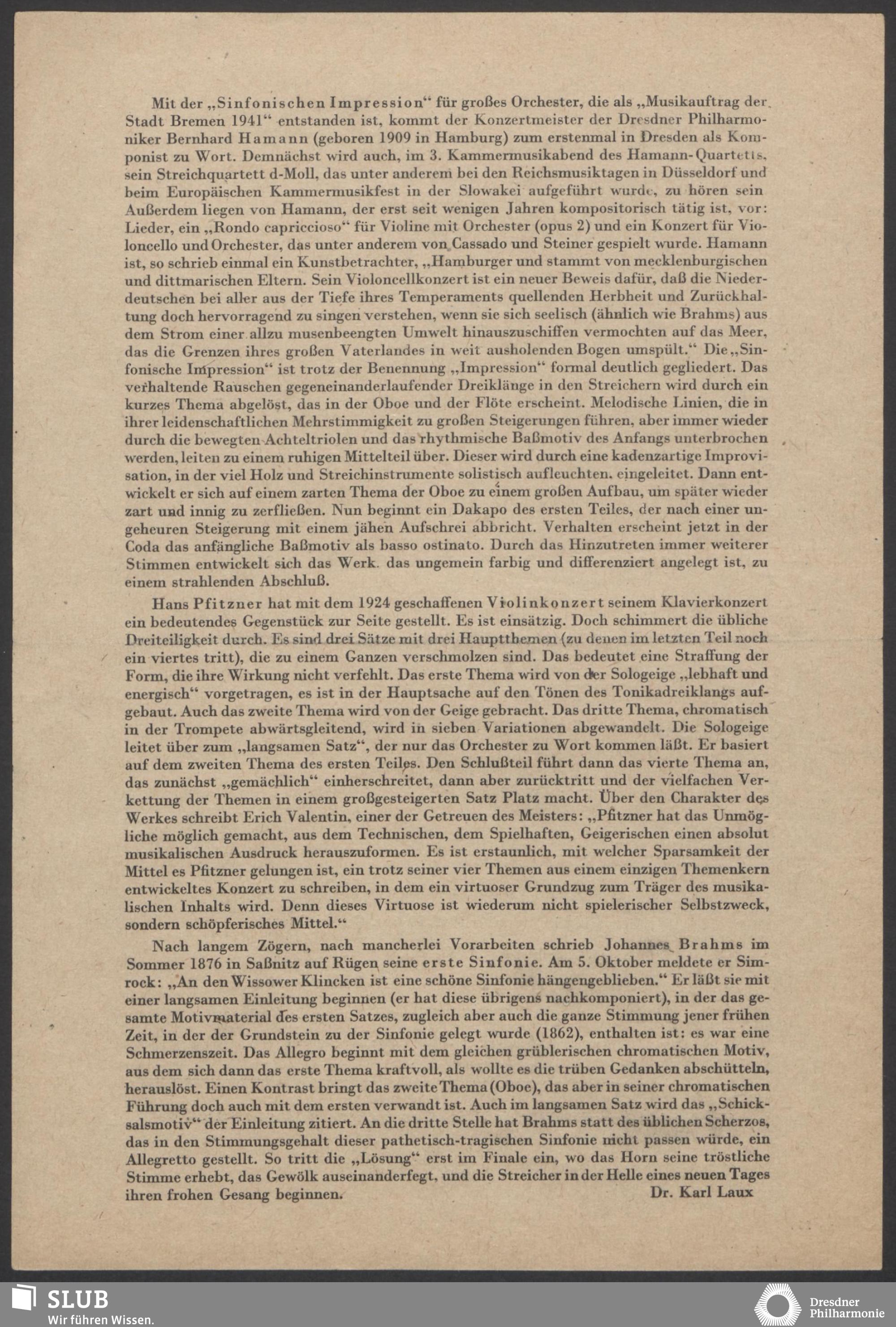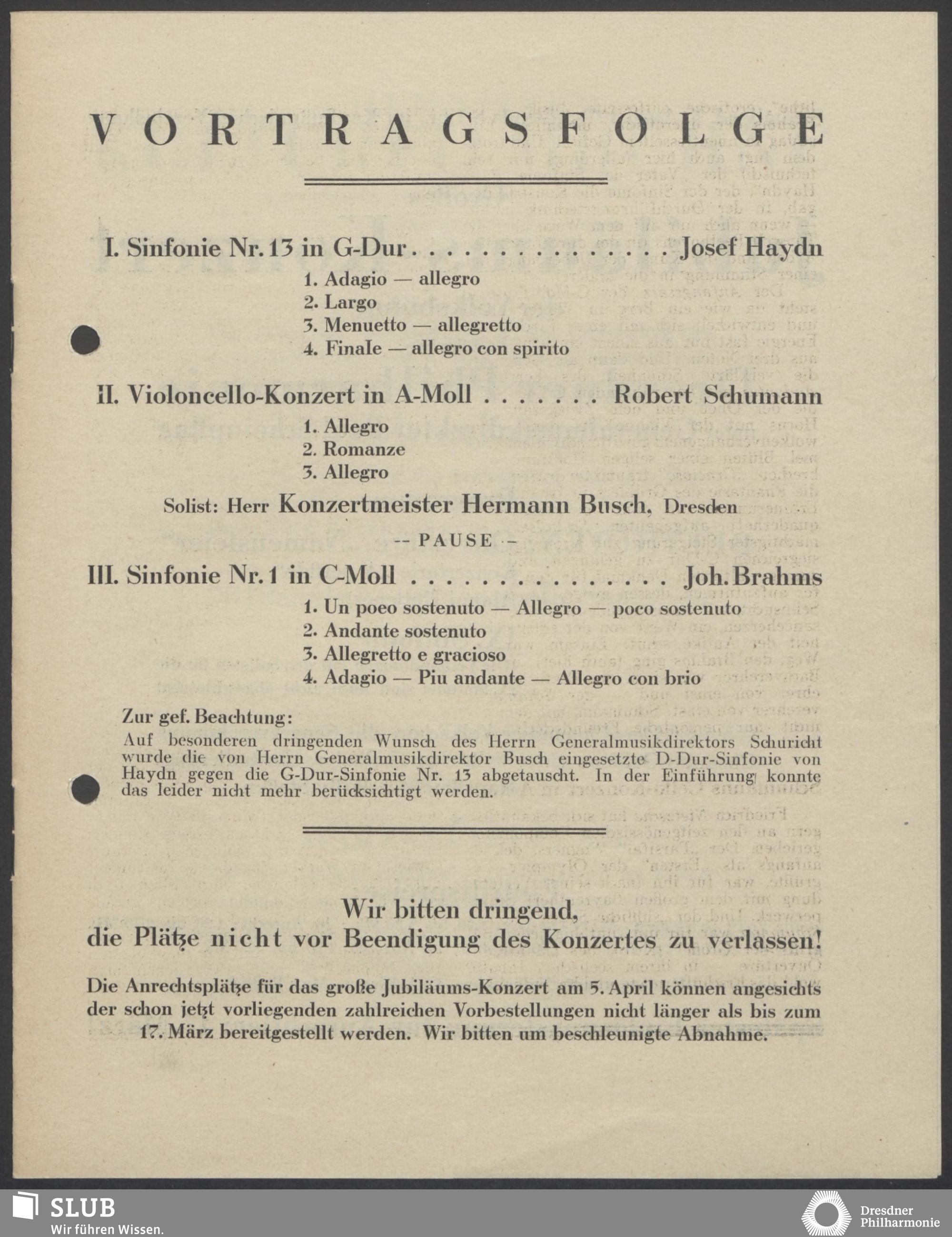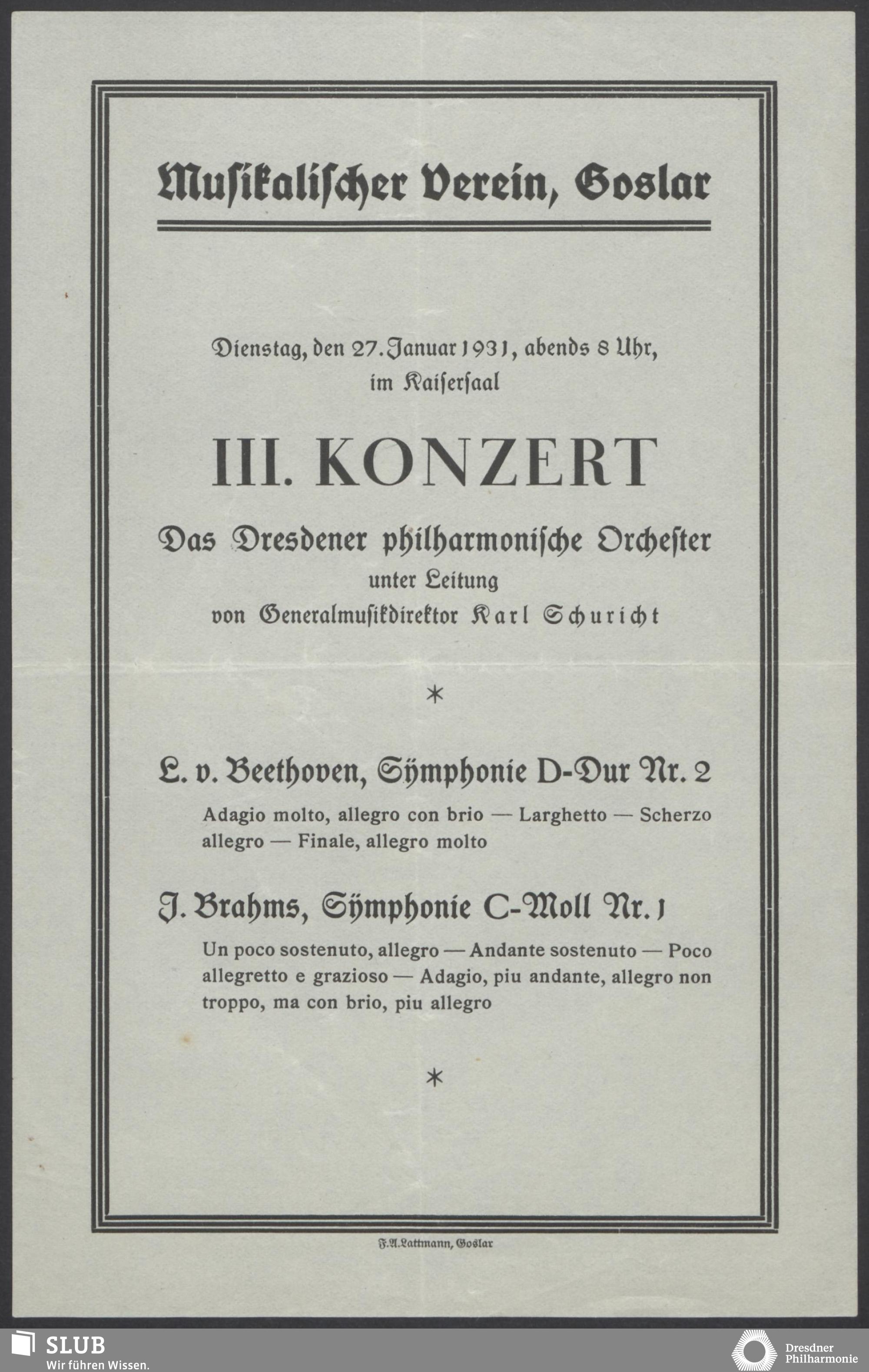 | 1914 | 8 March | Städtisches Kurorchester | 4 Uhr im Abonnement im grossen Saale | Liszt: Tasso, symphonische Dichtung, Kronke: Suite im alten Stil, Mozart: Symphonie in C-dur (Sym.40) | Franz Danneberg (Flöte), Walther Fischer (Klavier) | Symphonie-Konzert | WBB | |