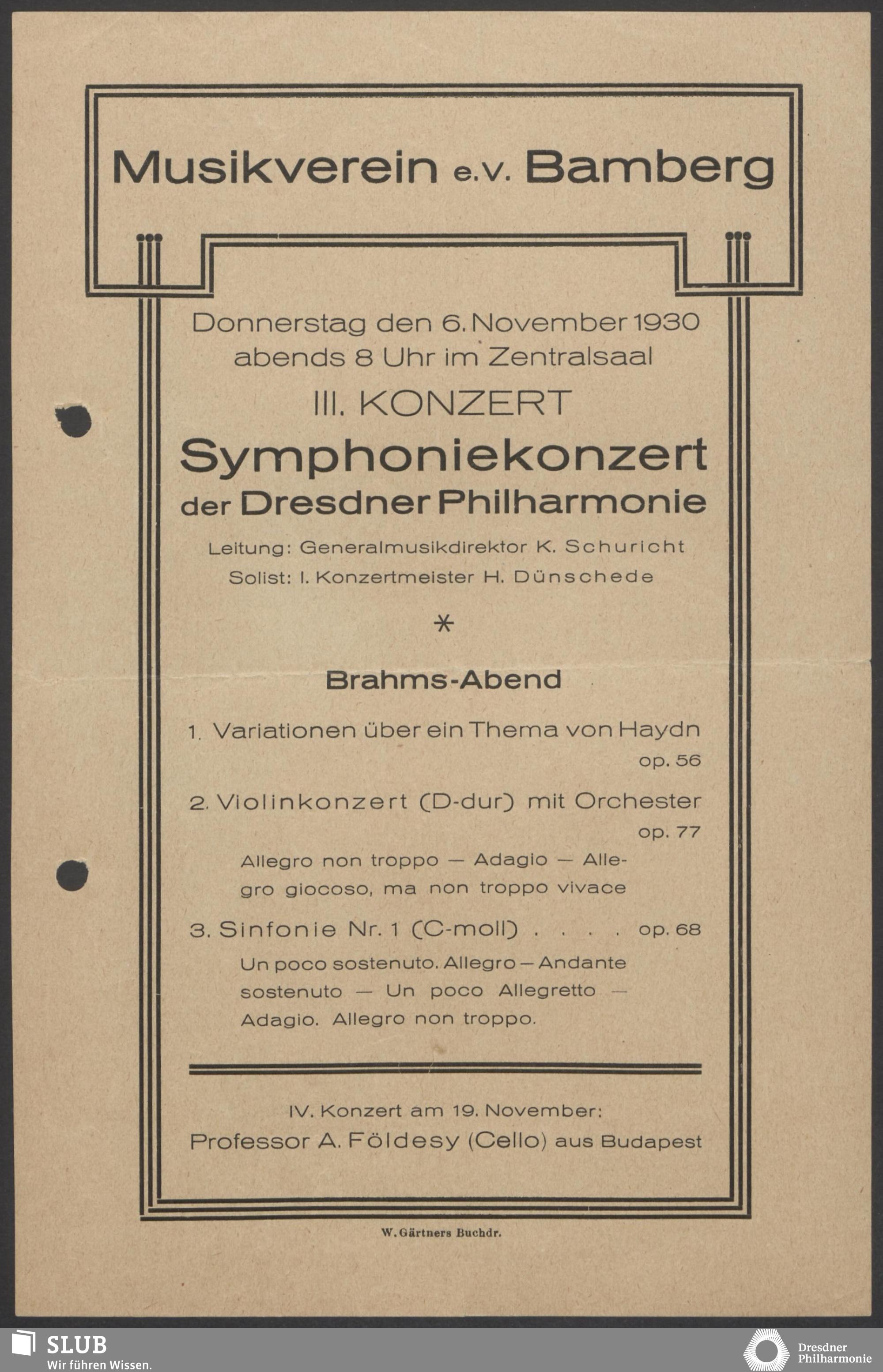 | 1913 | 14 November | Städtischen Kurorchesters | Wiesbaden, Kurhaus | Ernst Rudorff: Variationen für Orchester über ein eigenes Thema, Beethoven: Klavier konzert, Bach: Konzert für 3 Klaviere mit Orchester, Haydn: Sym.12 | Arthur Schnabel, Otto Voss, Alfred Höhn (Klavier) | IV. Konzert (Brahms-Abend) | WNN | |