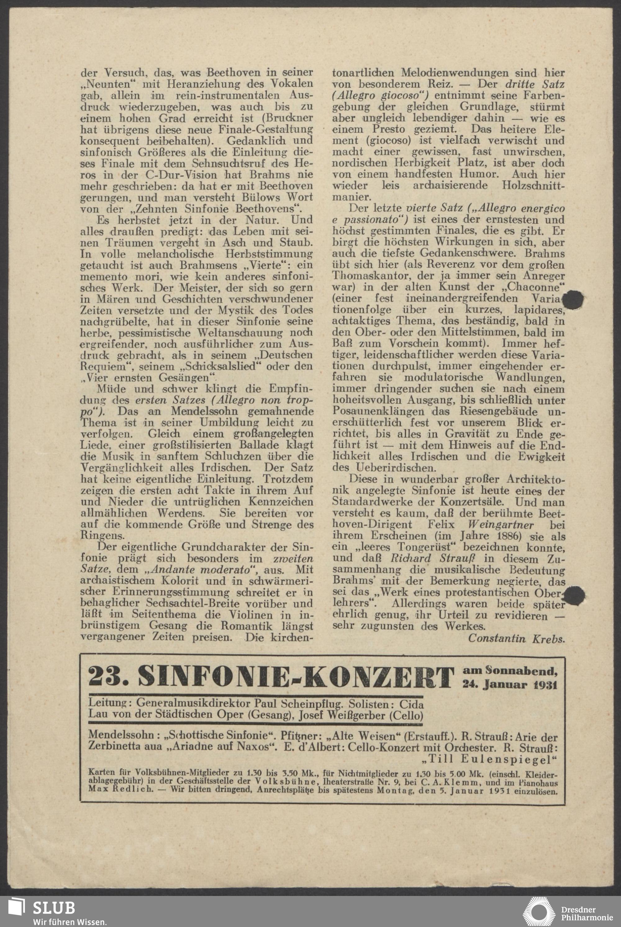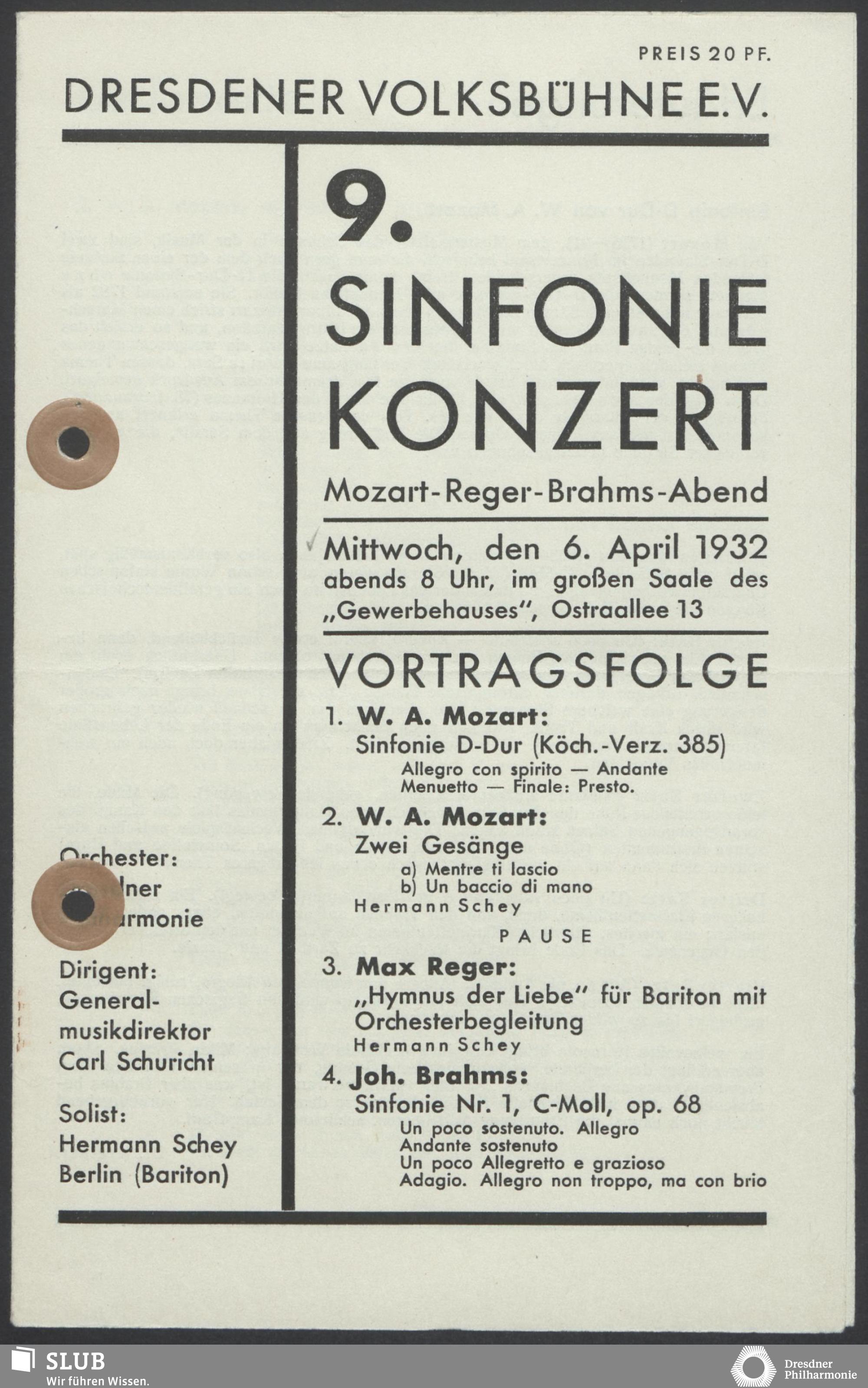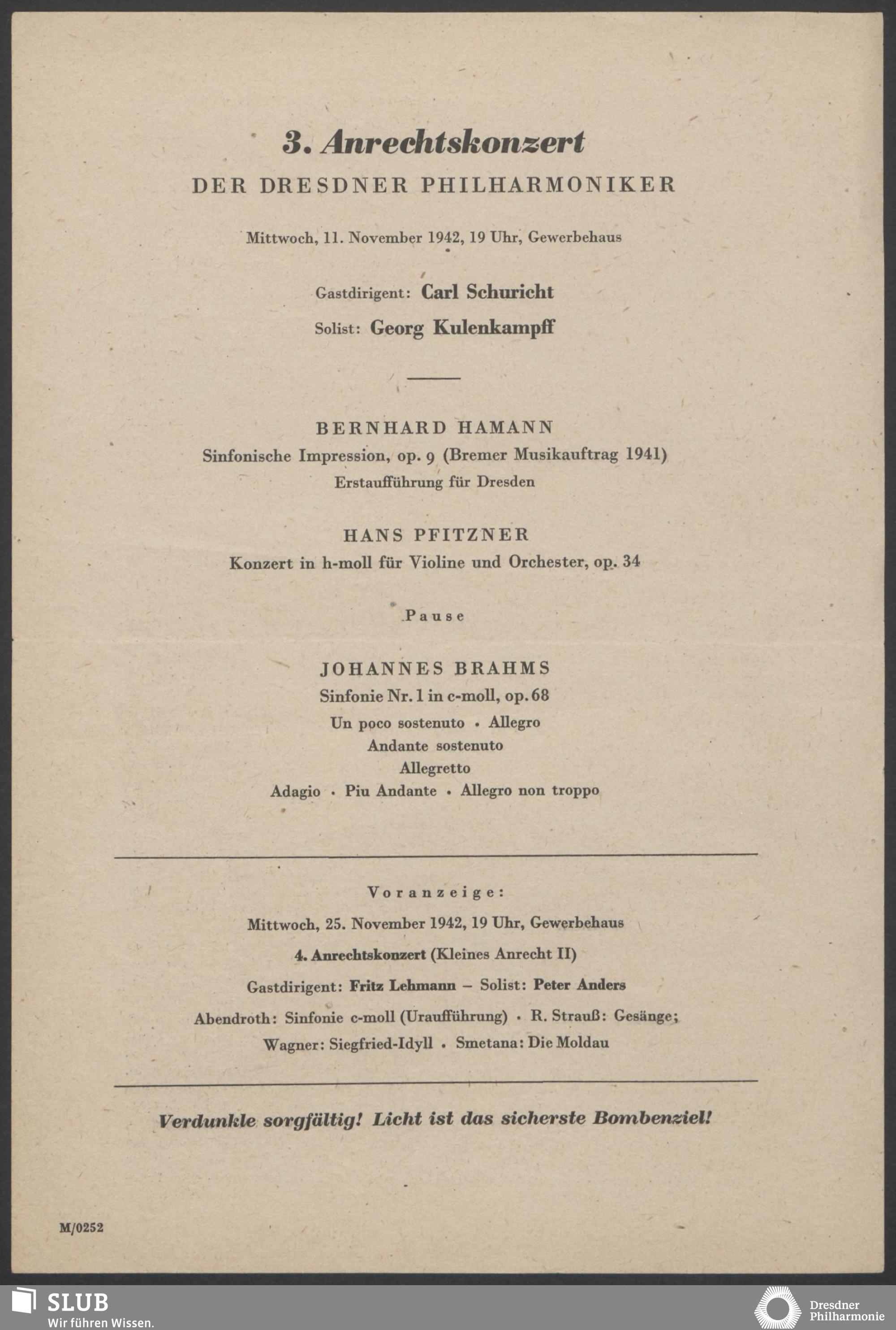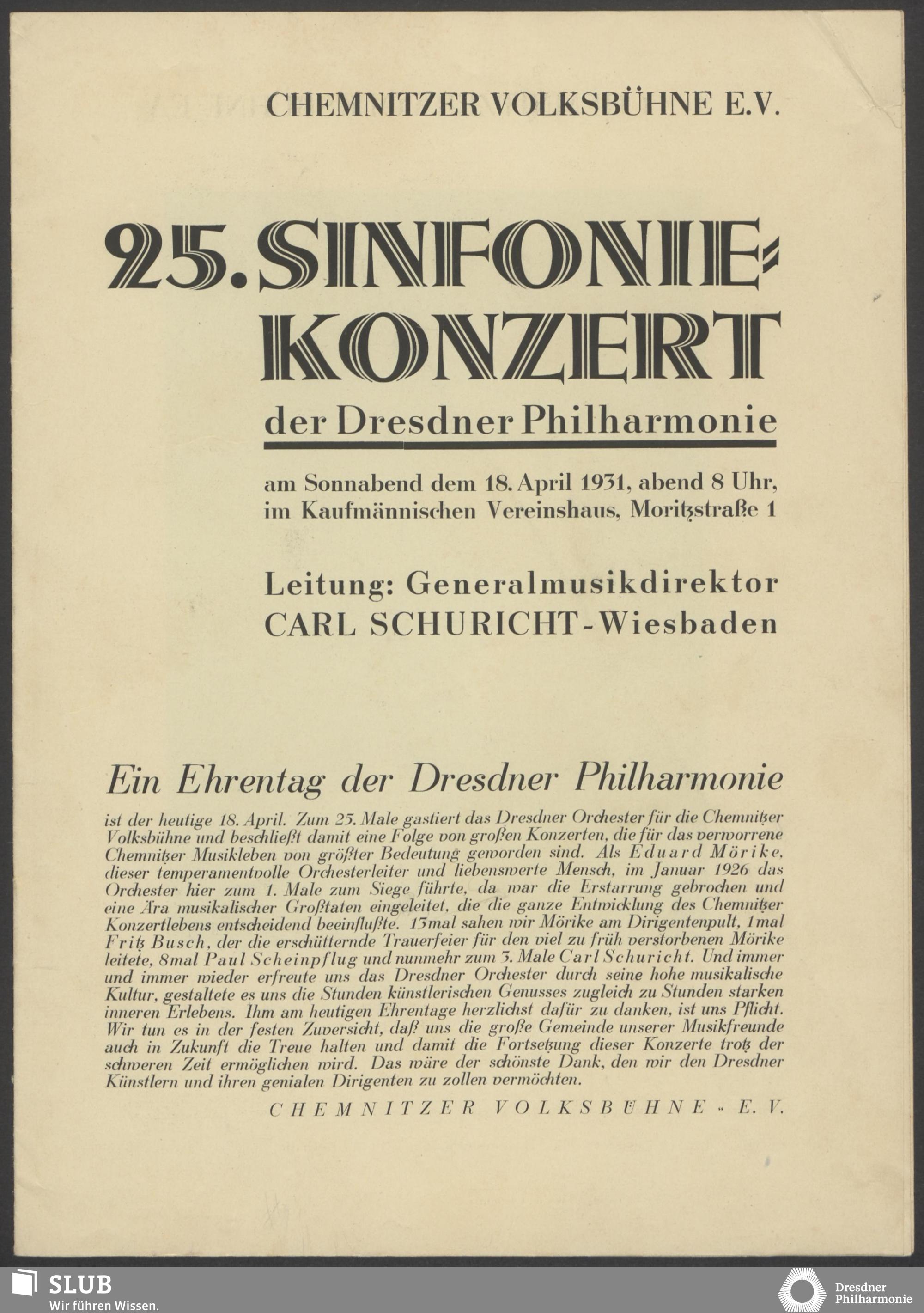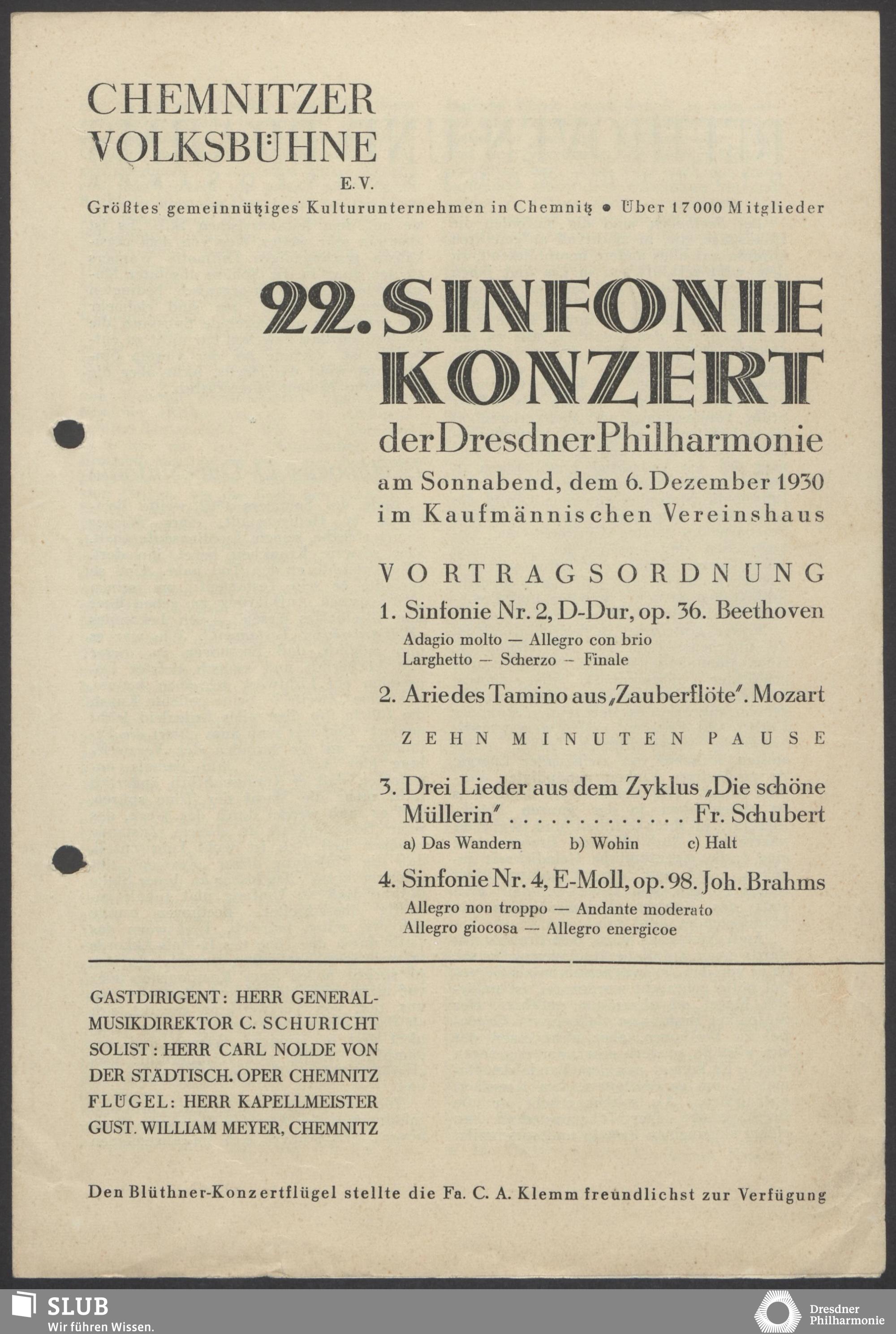 | 1914 | 6 February | Städtisches Kurorchester | 7 1/2 Uhr im grossen Saale | Pfitzner:Ouverture zu Kleist's "Käthchen von Heilbroun" conducted by the composer, Waldmonolog aus "Die Rose vom Liebesgarten", Ouverture zu "Das Christelflein", Schumann:Vier Lieder mit Klavierbegleitung, Schubert:Symphonie no.8, Wagner:Walther's Preislied aus der Oper "Die Meistersinger von Nürnber" | Walther Kirchhof (Tenor) | X Cyklus-Konzert | WB | |