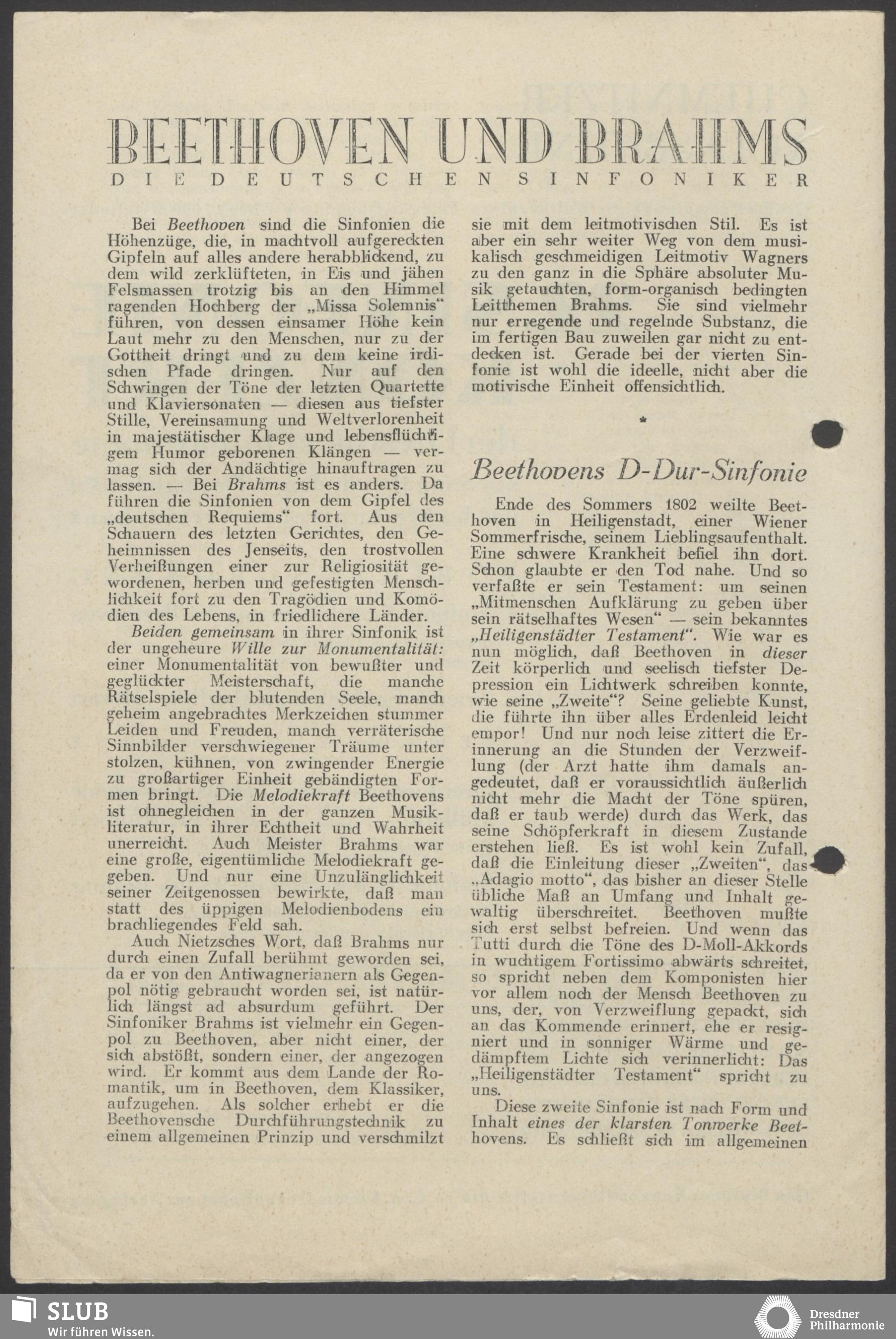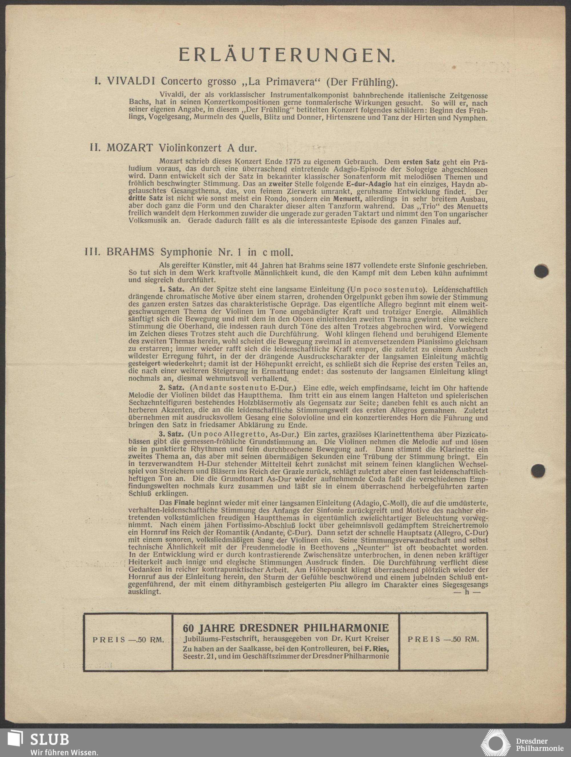 | 1914 | 15 April | Städtisches Kurorchester | Kurhaus Wiesbaden, Abends 8 Uhr | Beethoven: Ouverture "Zur Weihe des Hauses", Larghetto aus der II. Symphonie, Mozart:Eine kleine Nachtmusik (für Streichorchester), Schumann:Ouverture zu "Genovefa", Wagner: Vorspiel zu "Lohengrin", Tschaikowsky: Variations aus der Suite op.55 | Abonnements-Konzert | WZ, RV, WNN, WB | ||
