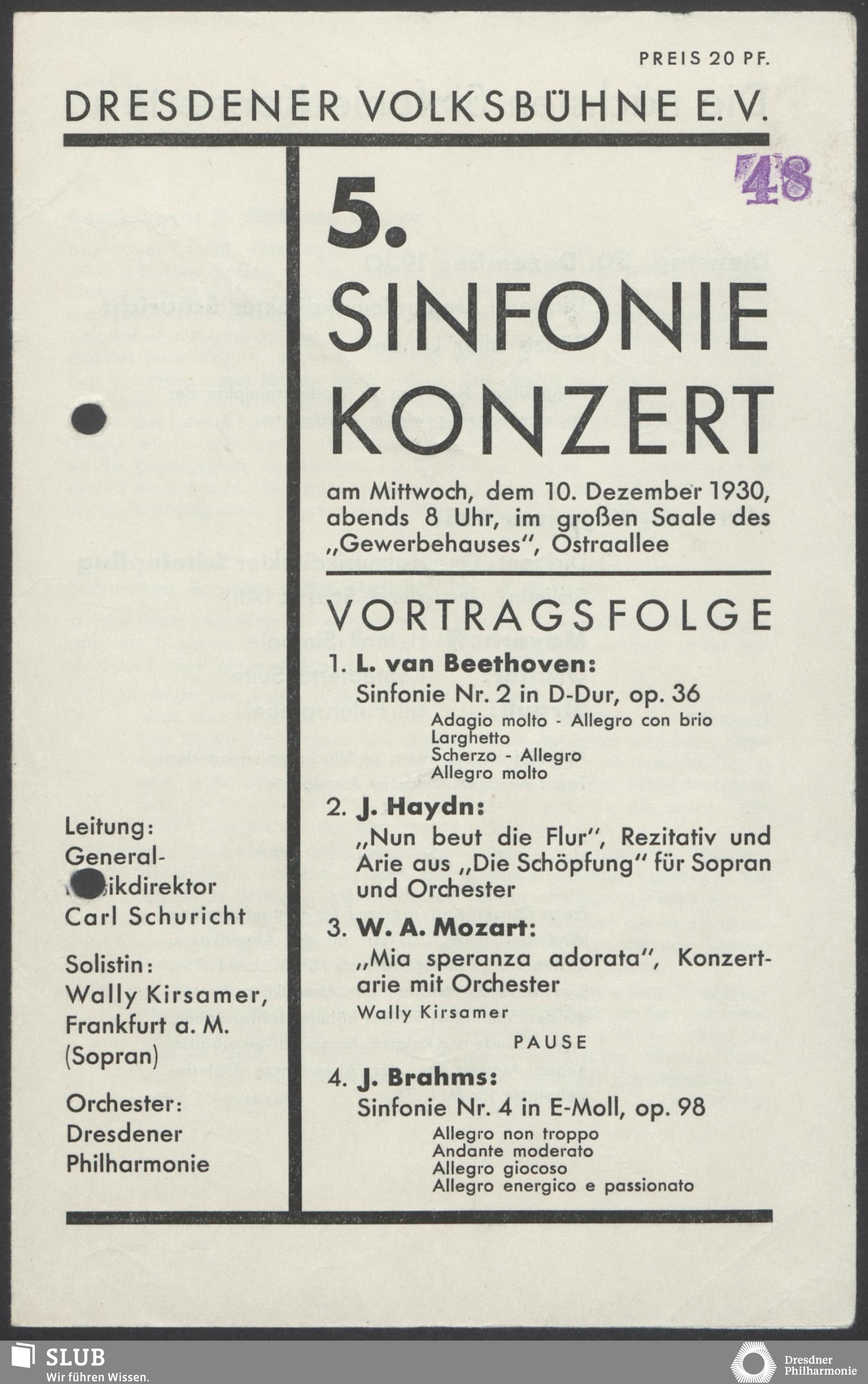 | 1914 | 23 March | Städtisches Kurorchester | Kurhaus Wiesbaden, Nachm. 4 Uhr | Mozart: Ouverture zu "Die Zauberflöte", Haydn: Variationen aus dem Kaiserquartett, Brahms: Menuette aus der D-dur-Serenade, Dupont: Chanson de jeune fille, Mendelssohn: Meeresstille und glückliche Fahrt, Berlioz: Carnaval romain | Adolf Schiering, Violine | 138. Abonnements-Konzert | WZ, RV, WNN, WB | |