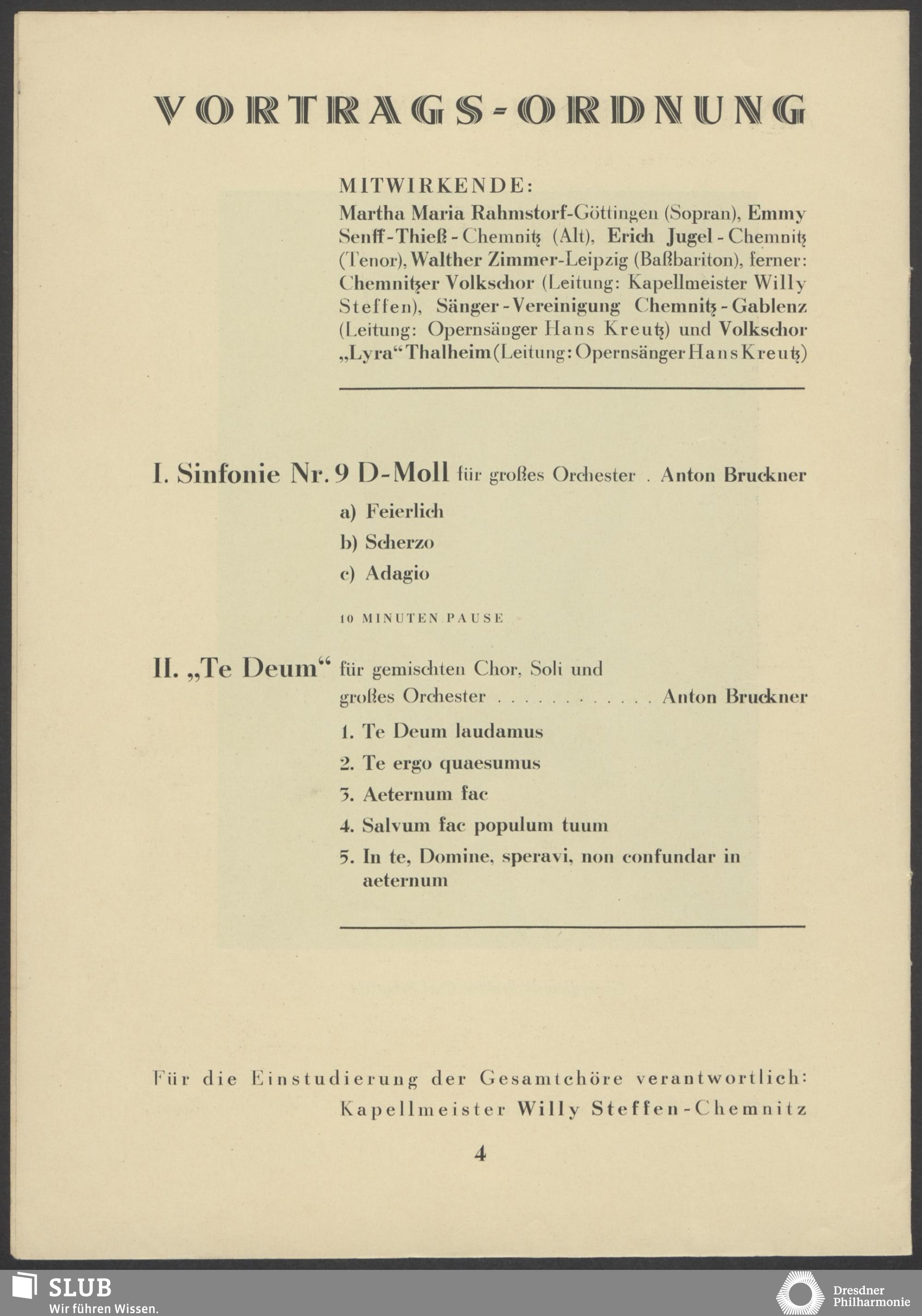| 1912 | 22 April | Das hiesige Theaterorchester | Frankfurt am Main, Saalbau, Großer Saal | Bruckner:Te Deum, Beethoven:Sym.9 | Anna Kämpfert, Elly Berlow, Paul Seidler, Julius Schüller, Rühl'scher Sangverein, Carl Hartmann (Org.) | 3. Abonnementskonzert | *4 | |