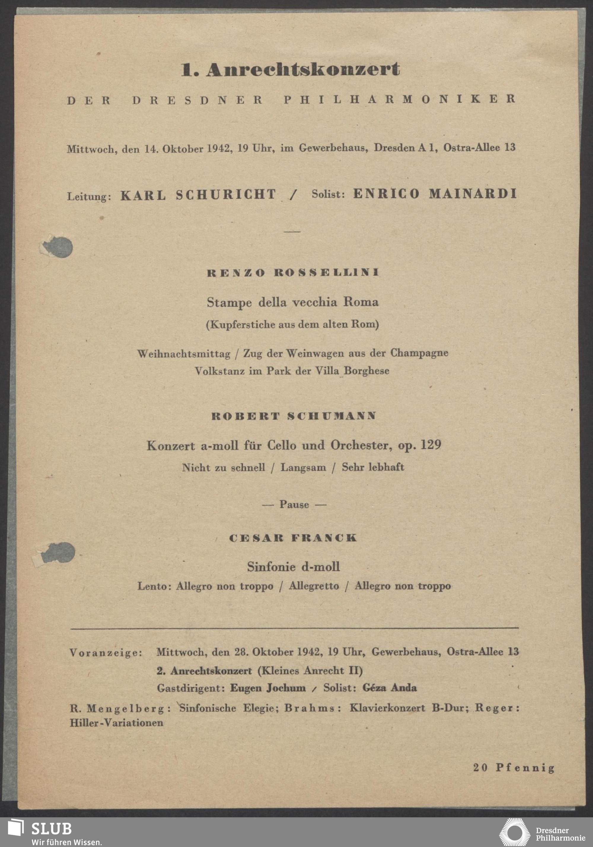| 1914 | 2 January | Städtisches Kurorchester | Wiesbaden, Kurhaus, Grosser Saal 20:00 | Gade:Nachklänge aus Ossian, Schumann:Ouverture zu "Manfred", Abendlied, Träumerei für Streichorchester, Schubert:Ouverture, Entr'acte aus "Rosamunde", Mendelssohn:Kriegsmarsch aus Athalia, Weber:Ouverture zu "Oberon" | 4. Abounements-Konzert (Romantiker-Abend) | WZ, WB | ||