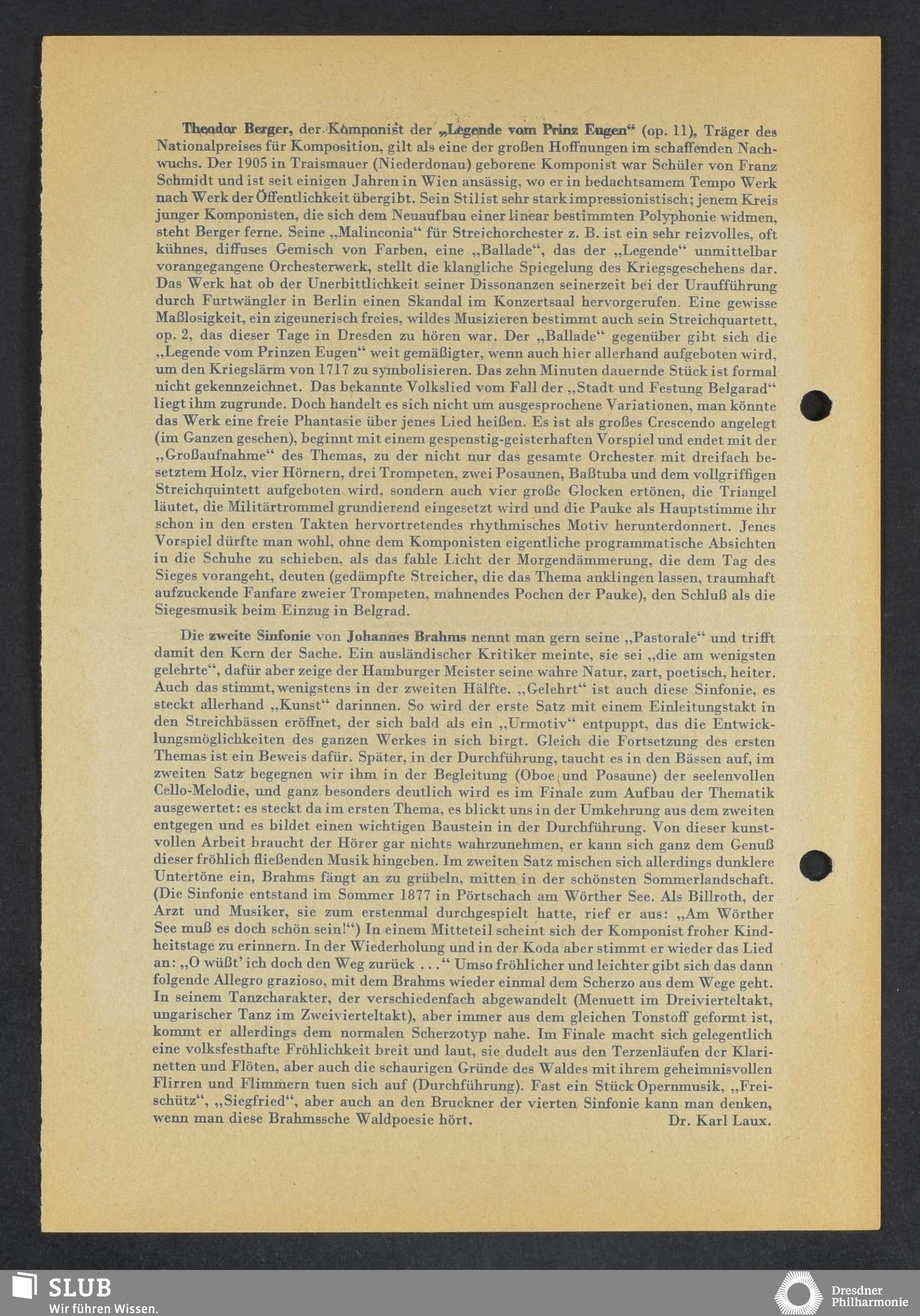 | 1914 | 2 January | Städtisches Kurorchester | Wiesbaden, Kurhaus, Grosser Saal 16:00 | Berlioz:Carnaval romain, Bizet:Carmen-Suite, Dorn:Vorspiel zu "Närodal", Haydn:Andante aus d. Symphonie mit dem Paukenschlag, Saint-Saëns:Phaëton, symphonische Dichtung, Grieg:Zwei Melodien für Streichorchester, Brahms:Akademische Fest-Ouverture | 3. Abounements-Konzert | WZ, WB | ||