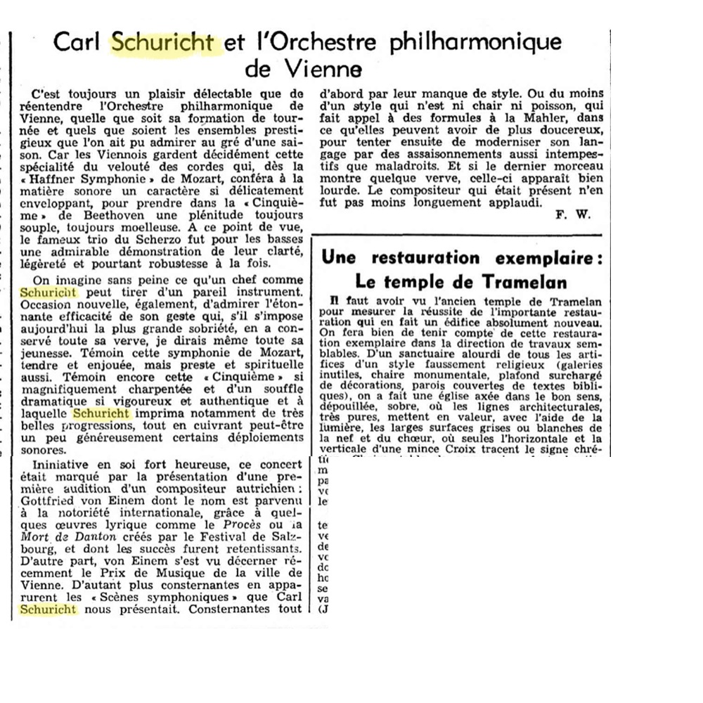 - "Carl Schuricht conduit au triomphe les Wiener Symphoniker" Journal de Genève (1958.3.25).