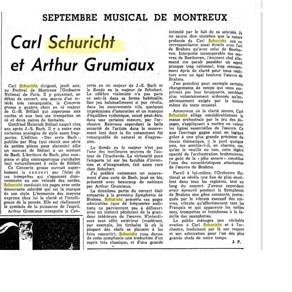 - "RÉPÉTITION GÉNÉRALE AVEC Carl Schuricht" Gazette de Lausanne (1954.9.17).