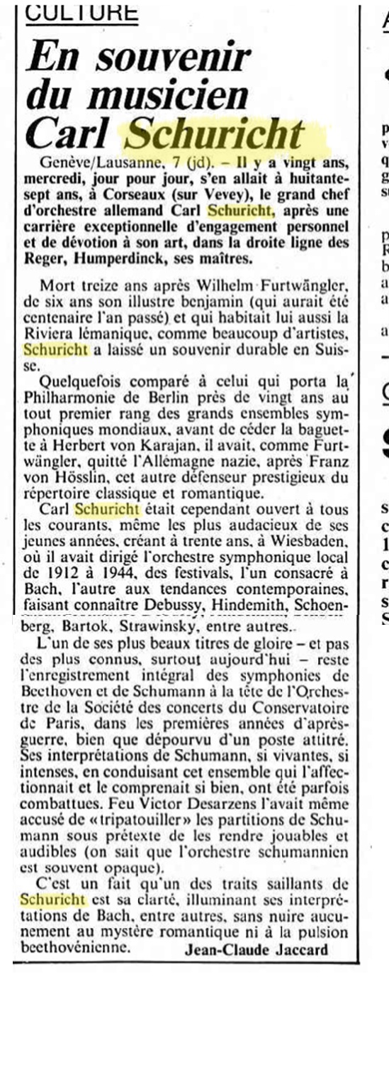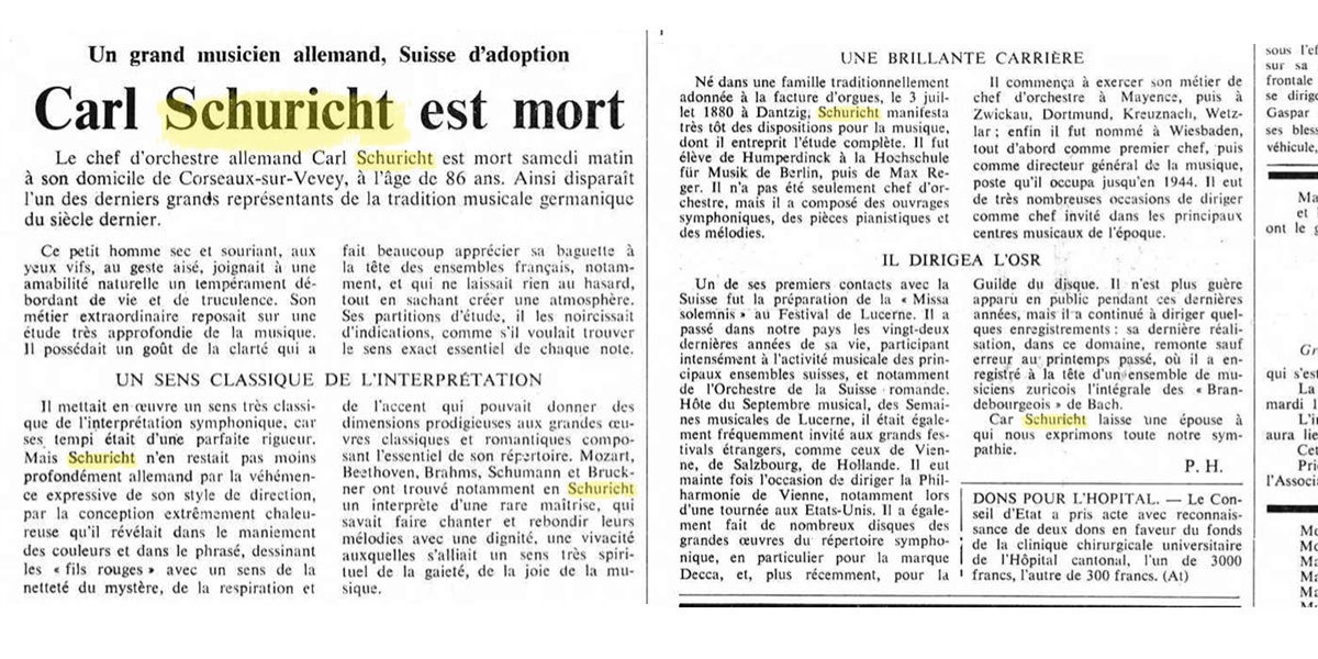 - "Carl Schuricht est mort" Gazette de Lausanne (1967.1.9).