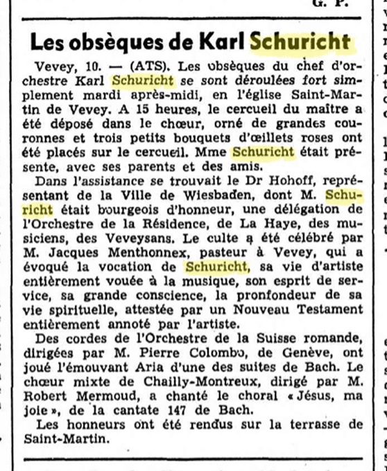 - "Les obsèques de Karl Schuricht" Journal de Genève (1967.1.11).