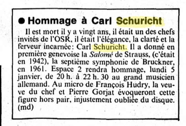 - "Hommage à Schuricht" Journal de Genève (1987.1.4).
